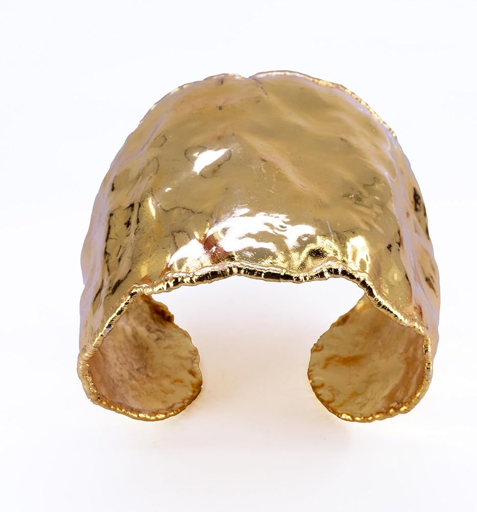 Beautiful crumpled extra wide solid copper cuff with 24K gold overlay & molten edging. These are very sturdy but adjustable. A little on the large side and probably not suitable for smaller wrist sizes. Sealed with high tech E-Coating, which will protect the cuff from oxidation, providing long-lasting wear & durability.