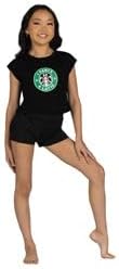 Cropped tee with crewneck and cuffed cap sleeves featuring our popular, I Dance A Latte screen print from seasons past. Polyester/Rayon.