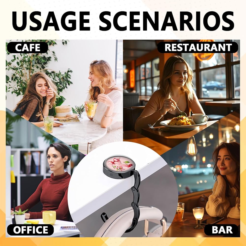 • Practical: This folding purse hook can keep your bag clean and safe. When you're in restaurants, offices, cafes and any public places, you just take it out and hang it on the edge of the table to hang your personal, freeing your hands
