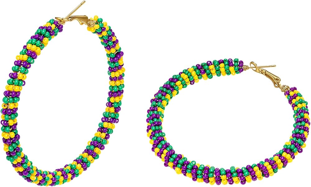 مجوهرات ماردي جراس النابضة بالحياة للنساء - تتميز هذه الأقراط الحلقية اللامعة خفيفة الوزن بلمسات من الترتر الأرجواني والذهبي والأخضر، مثالية لماردي جراس والكرنفال وحفلات رأس السنة والعطلات. يضيف التصميم المتدلي حركة احتفالية إلى أي ملابس.