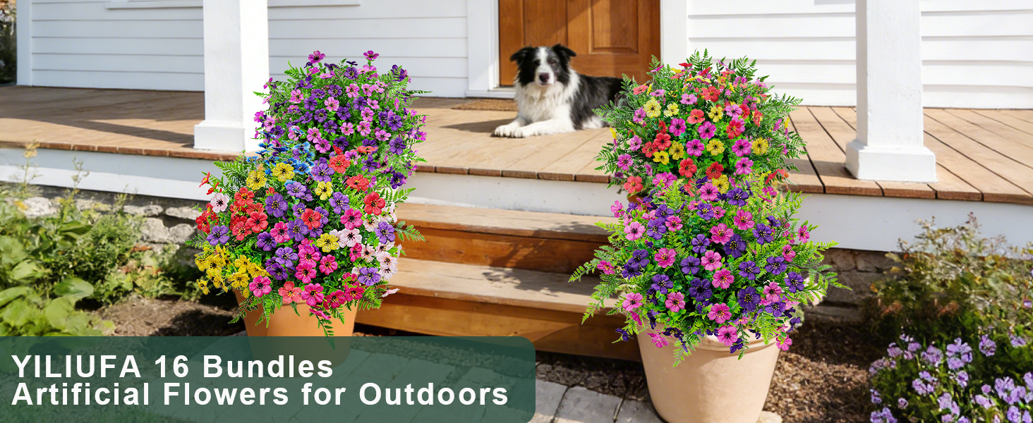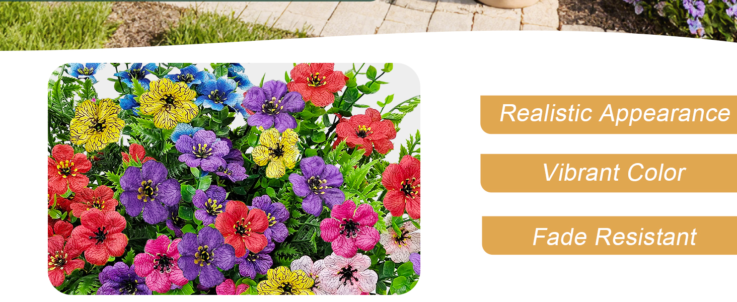 ديكور متعدد الاستخدامات: مناسب للديكور الداخلي والخارجي. يمكن وضع هذه الزهور الخارجية المقاومة للأشعة فوق البنفسجية في المزهريات والأبواب الأمامية والشرفة والساحات وصناديق النوافذ والشرفات. كما أنه ديكور ممتاز لحفلات الزفاف والحفلات والمناسبات الأخرى