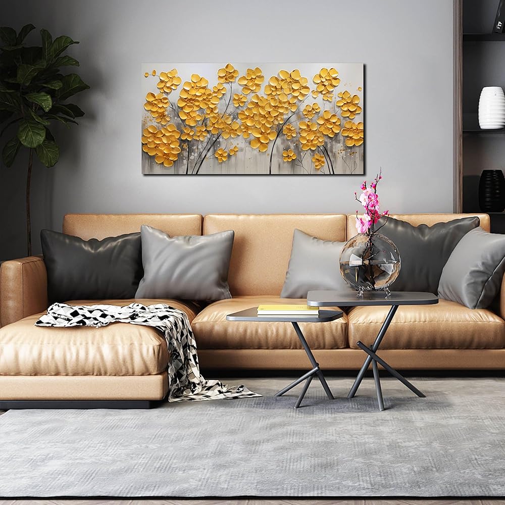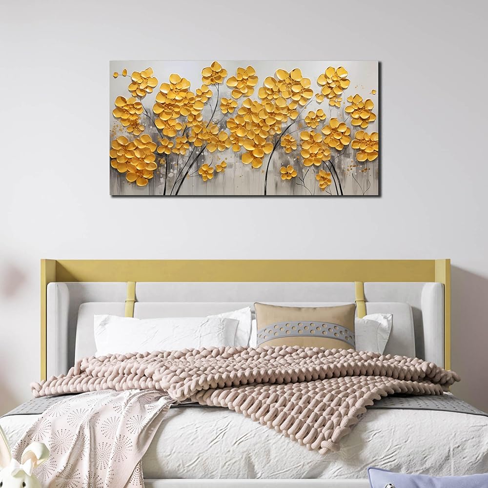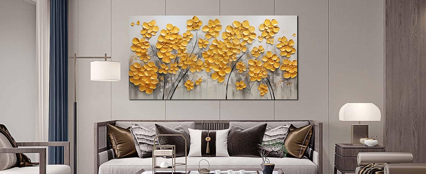 ديكور حائط عصري: هذا الديكور الفني الجداري ذو الزهور الذهبية يضفي على أي مساحة أجواء فنية وذوقًا عصريًا. إنه خيار مثالي لتزيين الجدران في أماكن مختلفة، بما في ذلك غرف المعيشة، والممرات، والسلالم، وغرفة الطعام، وغرفة النوم، والحمام، والمطبخ، والصالات، والنوم، والشقق، والفندق، والمطاعم، والبار، وغرفة الاجتماعات أو المكتب. من المؤكد أن هذه القطعة الفنية ستمنح مساحتك جوًا عصريًا وأنيقًا فريدًا