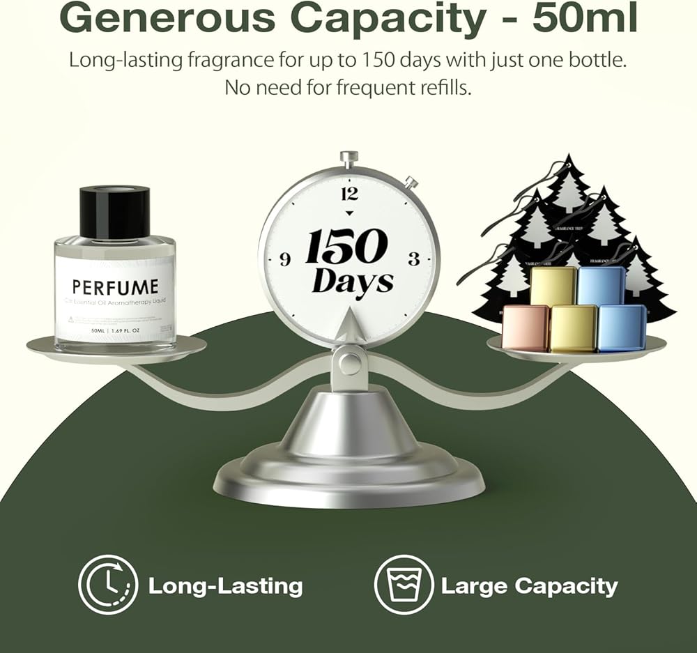 رائحة طويلة الأمد وفعالة: توفر كل زجاجة سعة 50 مل من عبوة معطر هواء السيارة الذكية هذه رائحة دائمة يمكن أن تدوم في أي مكان من شهر إلى 4 أشهر، اعتمادًا على تكرار الاستخدام والإعدادات، مما يجعله خيارًا ممتازًا لمحبي السيارات.