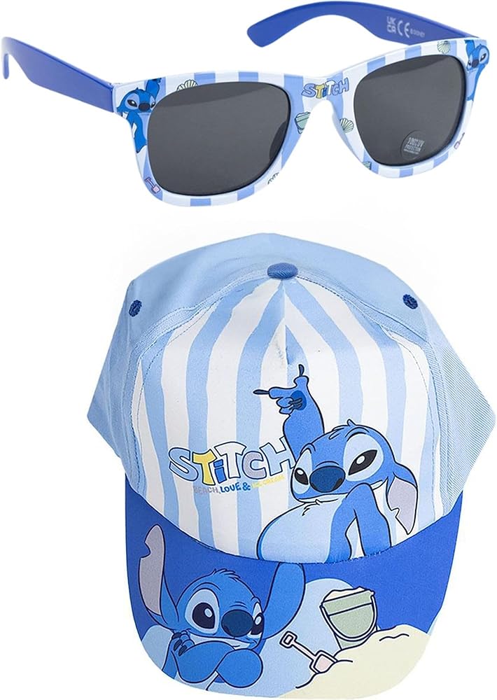 DISNEY STITCH KIDS CHARACTER FANS SET Includes a curved peak cap and sunglasses with colourful stitch motif. Ideal for boys and girls who like the playful and fun style of the figure. Adds a unique touch to any outdoor activity. Perfect for playtime, trips and holidays.