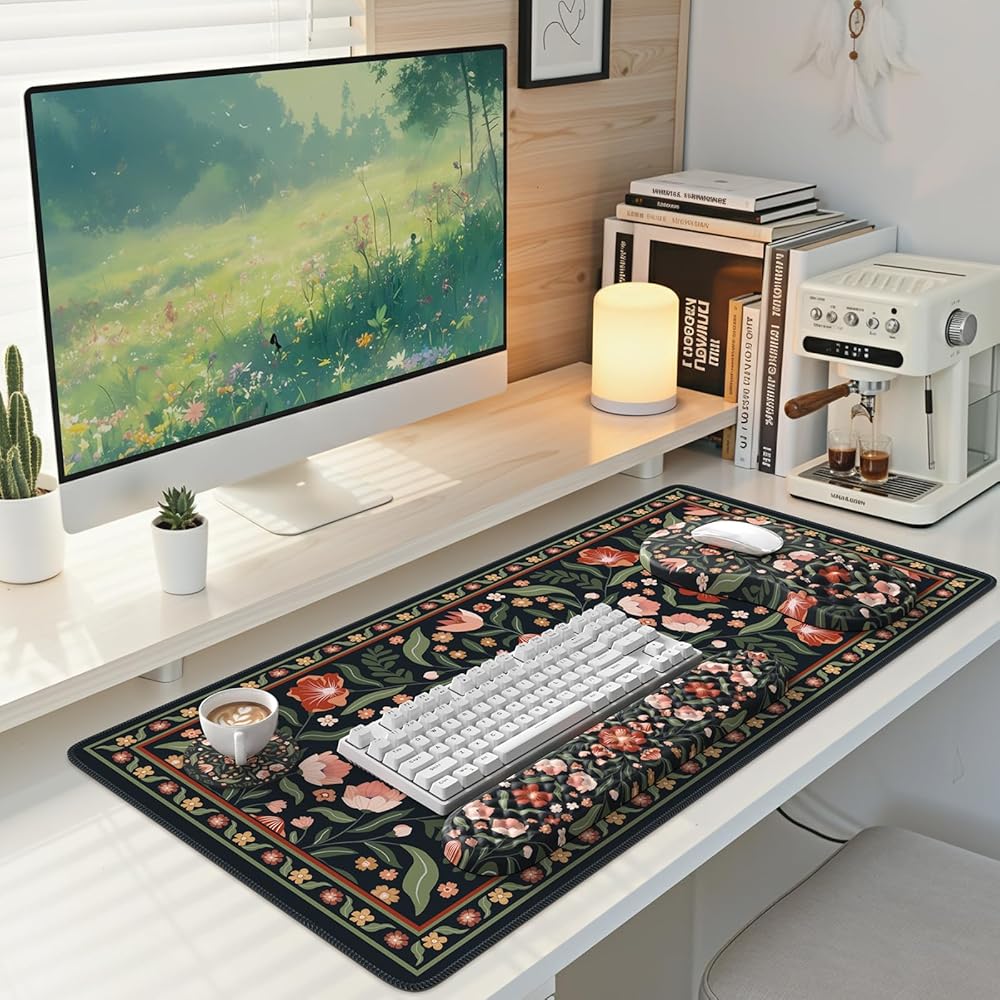 Elegant Vintage Garden Aesthetic: Inspired by classical gardens, this computer desk mat set design features soft, elegant florals and foliage, complemented by a delicate border. This artistic touch will imbue your home or office with a tranquil and romantic touch of nature.