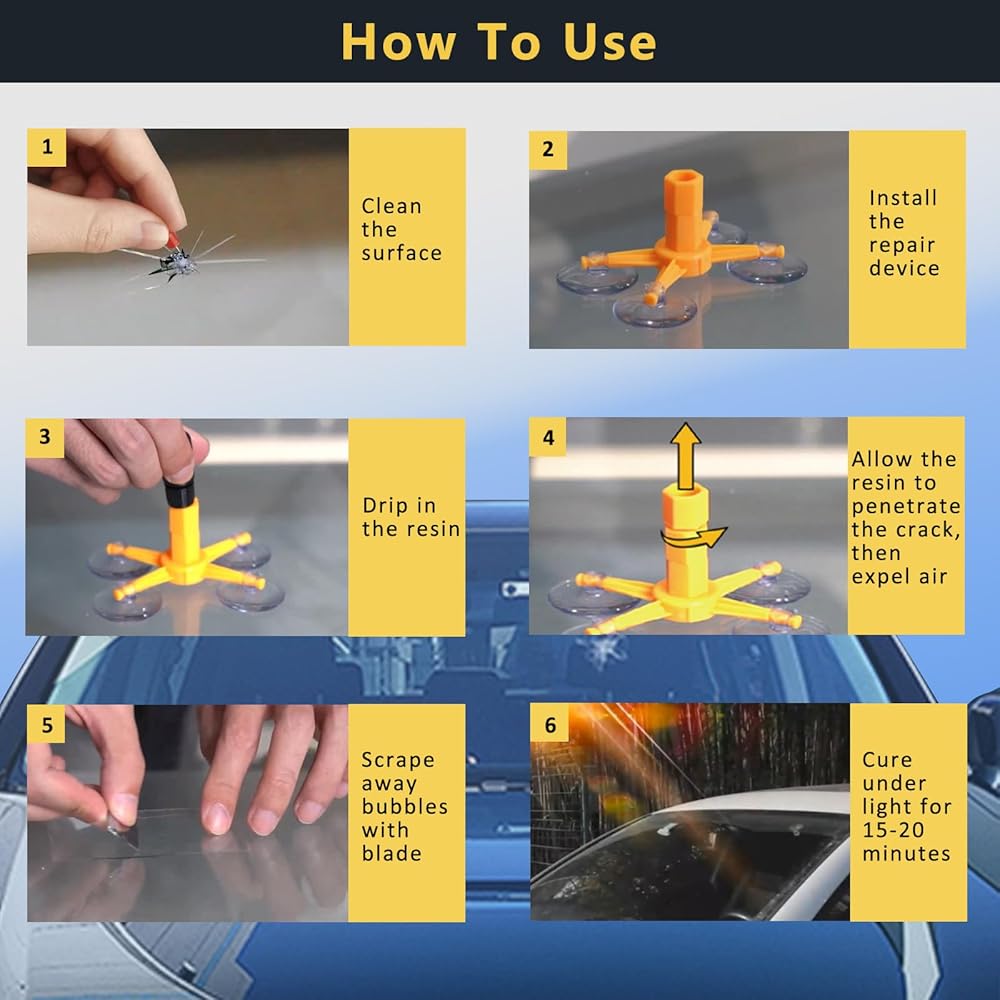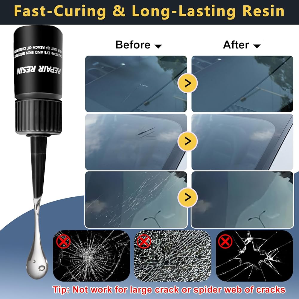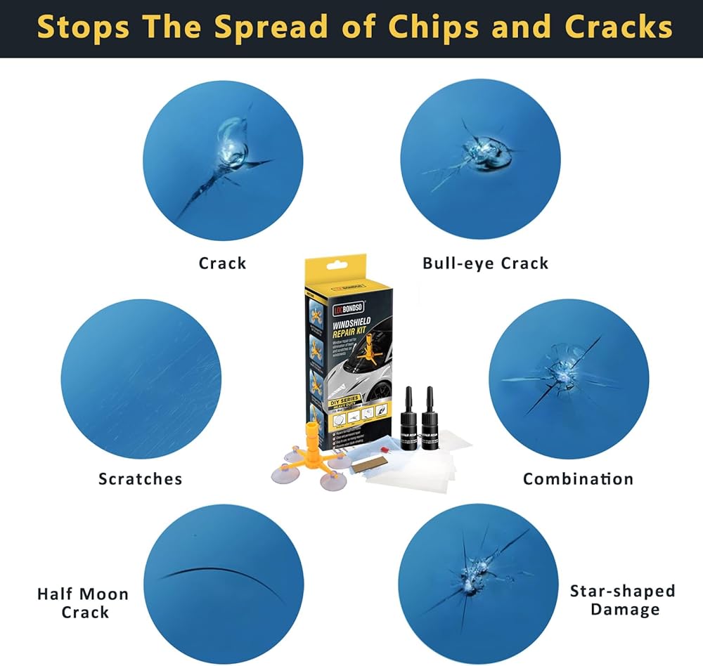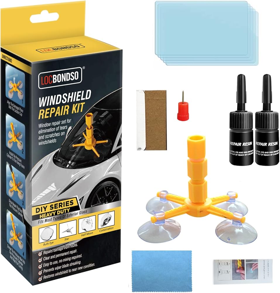 LOCBONDSO windshield repair kit, designed to quickly fix minor damage before it turns into a costly replacement. Whether you're dealing with bull‑eye, star‑shaped, or small cracks on laminated automotive glass, this easy DIY solution helps seal chips and cracks to slow further spreading, restoring clarity and safety for everyday driving. Featuring an upgraded syringe thruster design, our windshield chip repair kit enhances resin penetration for stronger, more reliable results—no mixing required. With simple, straightforward steps, anyone can perform fast, low‑effort repairs at home without professional tools or experience. The fast‑curing, advanced resin formula creates a durable, long‑lasting bond that holds up against daily use and varying weather conditions, saving you time and money on expensive auto glass services. Universal compatibility allows this kit to work on most cars, trucks, and other vehicles equipped with laminated windshields. Everything you need for a car windshield crack repair kit is included in one all‑inclusive set: 1 repair device with syringe thrusters, 2 repair resins, 1 razor blade, 1 push pin, 1 cleaning cloth, and 5 curing films. This auto glass repair kit is an essential addition to any car owner's emergency toolkit, delivering convenient, dependable results whenever and wherever you need them.