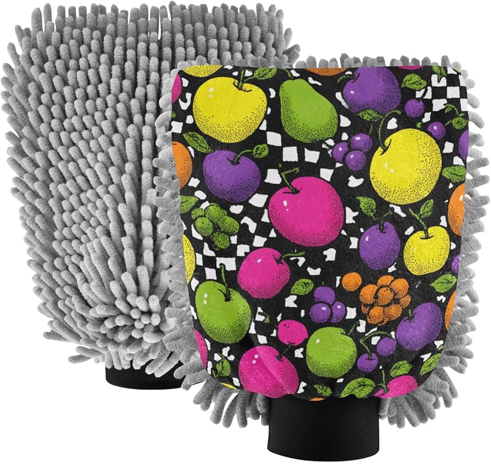 قفاز غسيل السيارات من AIXIWAWA، قفاز غسيل بنمط الفواكه، طباعة خالية من الخدوش، ماص للماء، 2 عبوة متوسطة الحجم