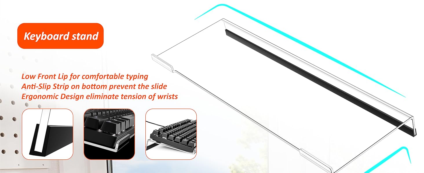 الشفة الأمامية ذات التدفق المنخفض في النهاية: يمكن لرافعة لوحة المفاتيح للمكتب أن تثبت لوحة المفاتيح الخاصة بك في مكانها وتجعل يديك مريحة. حتى أنك لن تشعر بالشفة الأمامية عند الكتابة باستخدام حامل لوحة المفاتيح الخاص بنا. حامل لوحة المفاتيح الأكثر راحة لرف الأكريليك المكتبي لملحقات المكتب.