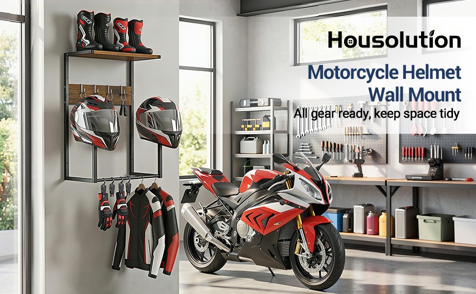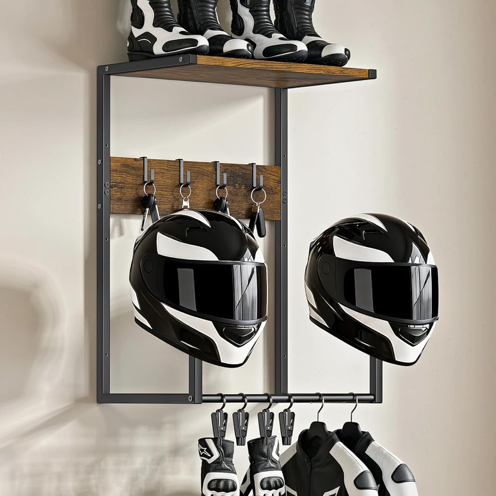 هيكل قوي: جميع إطارات وقضيب حامل خوذة الدراجة النارية لدينا مصنوعة من معدن قوي مع سطح أملس ومقاوم للماء ومقاوم للصدأ. يمكنك تعليق سترات وأحذية الدراجات النارية والملابس والمعاطف دون القلق بشأن الانحناء أو الاعوجاج. يتميز بألواح خشبية ممتازة لضمان المتانة، ويمكن لرف الخوذة هذا حمل وزن معداتك بسهولة.