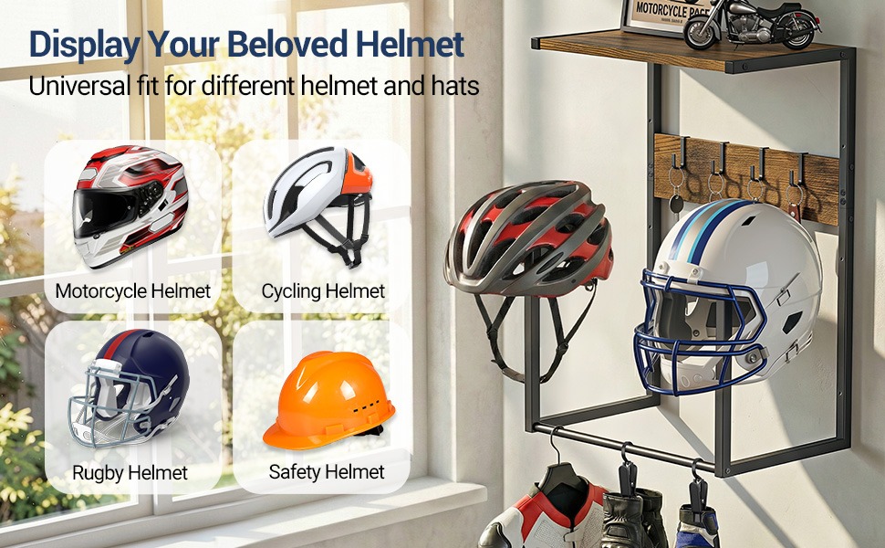 اختيار رائع للهدايا: بمظهر كلاسيكي، سيعزز رف خوذة الدراجة النارية نمط أي مساحة لديك. يُعد حامل الخوذة هذا مثاليًا كهدية لراكبي الدراجات النارية ولاعبي كرة القدم وراكبي الدراجات وعشاق الرجبي وعشاق عرض الخوذة وأي شخص يحتاج إلى حل عملي لتخزين المعدات.