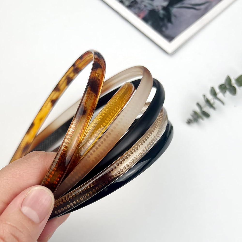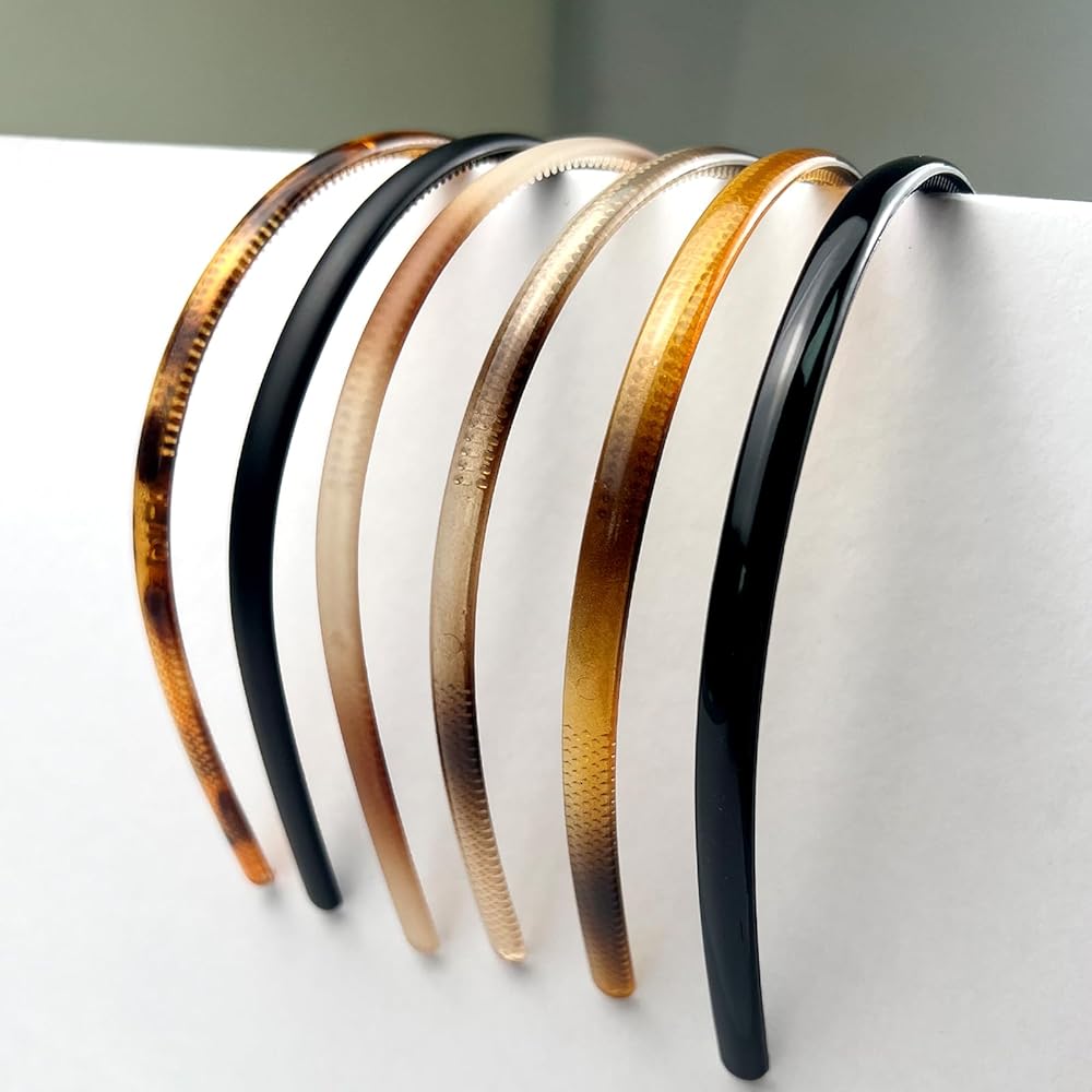 The set includes six skinny plastic headbands in assorted colors, catering to diverse styling needs and preferences for different occasions.