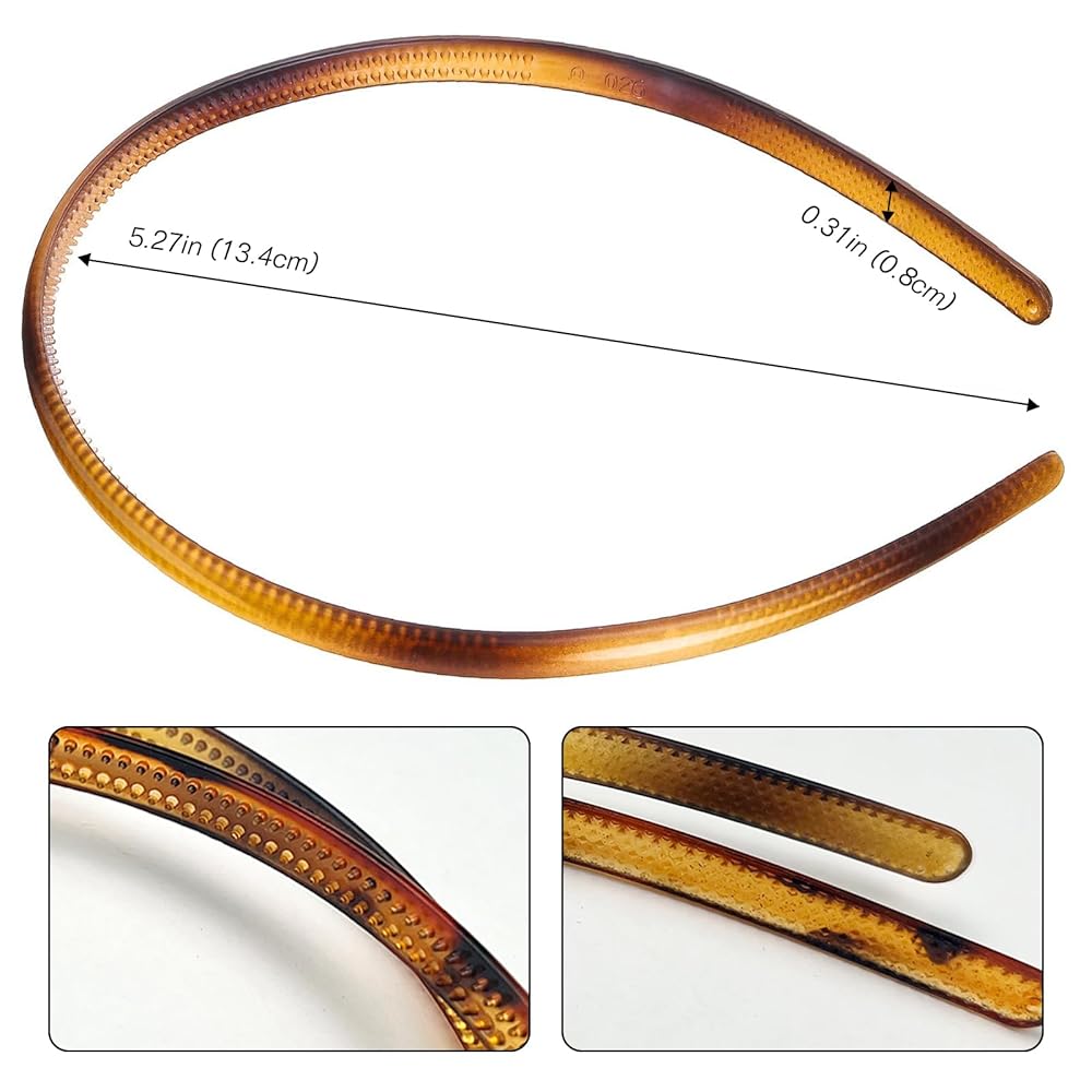 Introduce a versatile addition to your accessory collection with our 6-Pack of Multi-Color Plastic Skinny Headbands, perfect for women and girls with various hair types. Each pack contains six slim, 8mm wide headbands designed to offer both functionality and style. Made from durable polycarbonate, these headbands boast excellent elasticity, ensuring they remain intact without breaking. Their smooth surface is gentle on the hair and scalp, allowing for extended wear without discomfort. These lightweight headbands are not just practical for keeping hair out of your face while applying makeup or engaging in daily activities, but they also add a fashionable touch to any outfit. Whether you're dressing up for a party, traveling, or simply going about your everyday routine, these headbands are a chic and comfortable choice. Their simple yet elegant design is complemented by a range of assorted colors, making it easy to match them with various looks. The inclusion of multiple teeth along the comb ensures a non-slip grip, keeping the headband securely in place while being narrow enough at just 0.5 cm wide to maintain comfort throughout the day.