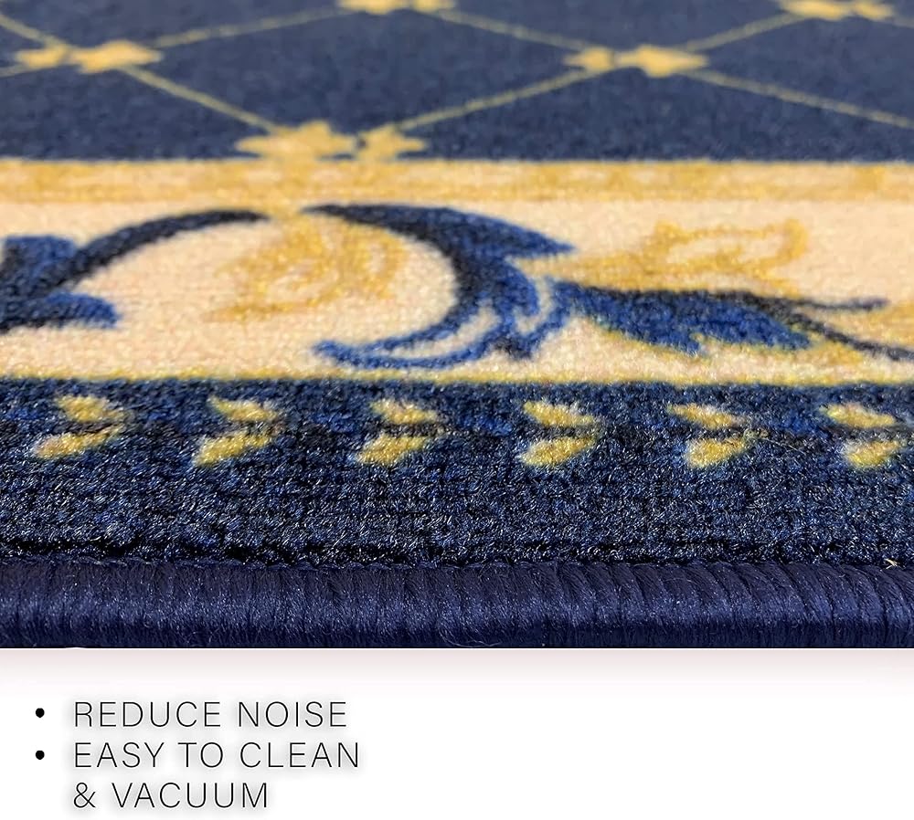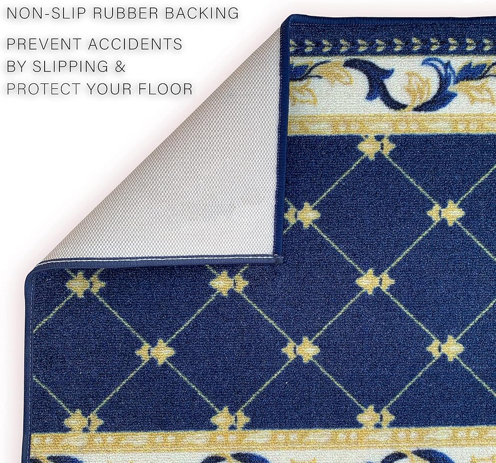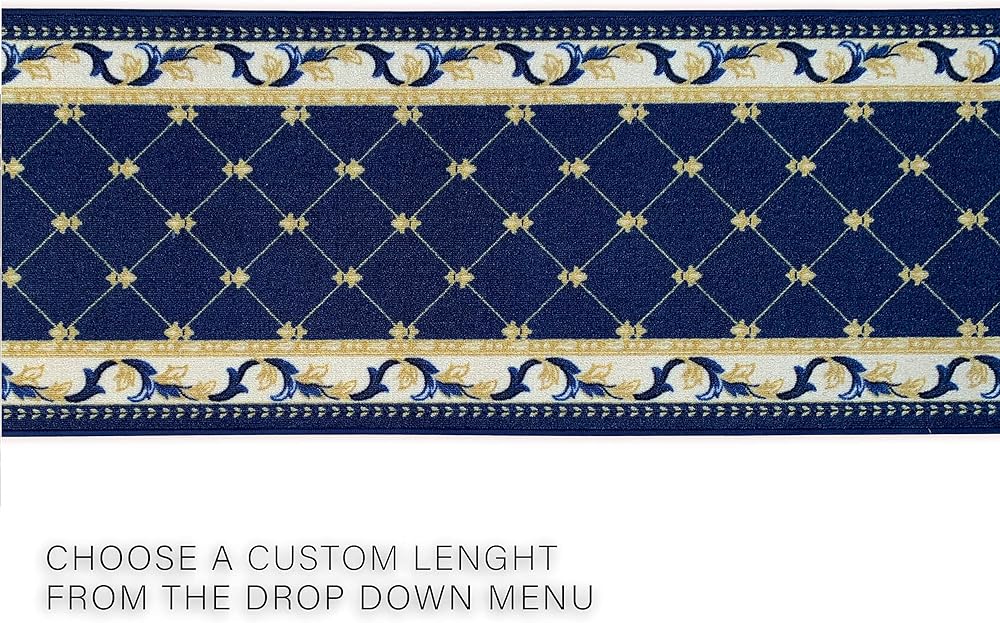 سجادة عداء مصنوعة حسب الطلب، كومة منخفضة مع دعامة مطاطية لمدخل بهو المطبخ، اختر مقاس الطول الخاص بك 26 بوصة، تصميم فلور دي ليز، تصميم فرنسي أزرق اللون (6 أقدام × 26 بوصة)