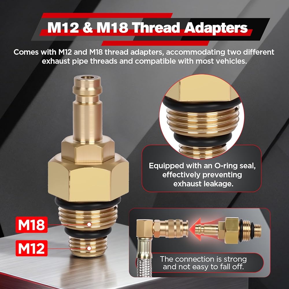 • 【محولات خيط M12 وM18】يأتي جهاز اختبار الضغط الخلفي للعادم مع محولات خيط M12 وM18، مصنوعة من النحاس عالي الجودة، وتستوعب خيطين مختلفين لأنابيب العادم ومتوافقة مع معظم المركبات. يتميز المحول بحلقة دائرية من أجل إغلاق جيد، مما يمنع تسرب العادم بشكل فعال وبالتالي تجنب القراءات غير الصحيحة، مما يوفر لك نتائج قياس دقيقة.