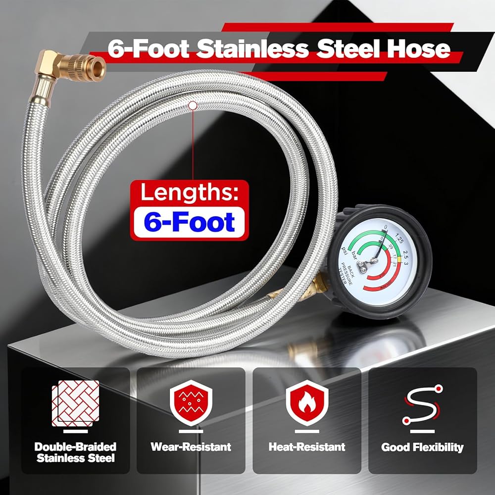 • خرطوم مقاوم لدرجات الحرارة العالية من الفولاذ المقاوم للصدأ بطول 6 أقدام: خرطوم جهاز اختبار الضغط الخلفي للعادم مصنوع من الفولاذ المقاوم للصدأ المضفر المزدوج عالي الجودة، وهو ليس مقاومًا للتآكل فحسب، بل يساعد أيضًا في مقاومة الحرارة، مما يسمح له بالعمل بشكل طبيعي حتى في البيئات ذات درجة الحرارة العالية بالقرب من مشعب العادم. بالإضافة إلى ذلك، يسمح طول الخرطوم الذي يبلغ 6 أقدام للمستخدمين بإجراء الاختبارات مباشرة من مقعد السائق، كما أن مرونته تجعل الاختبار مناسبًا في الأماكن الضيقة.