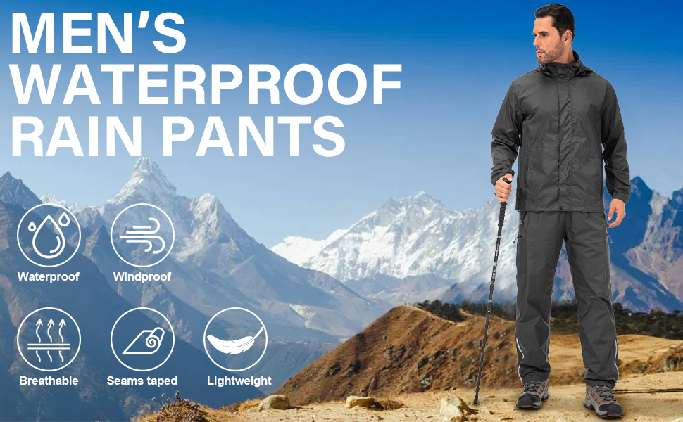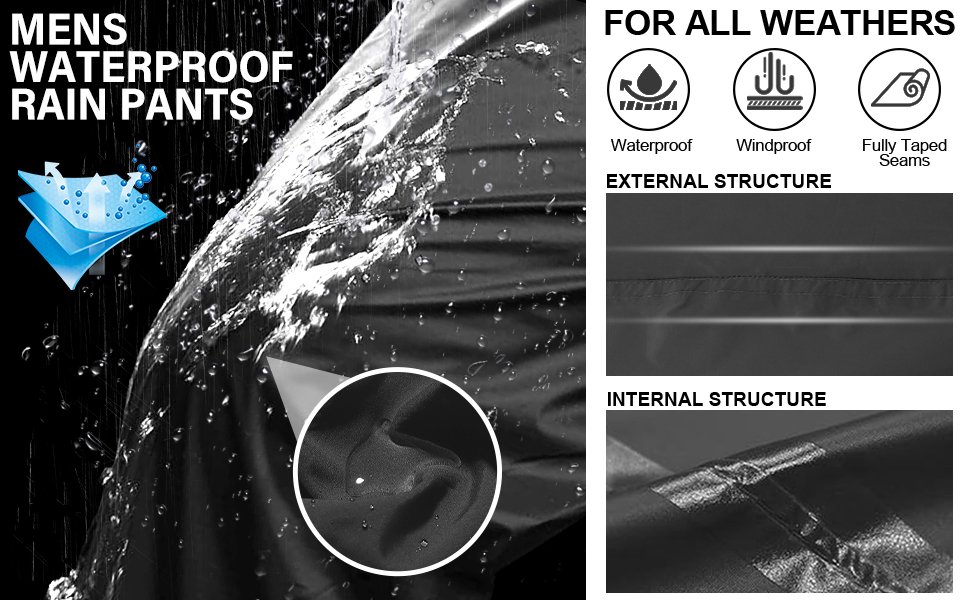 سراويل المطر للرجال: سراويل رجالية مقاومة للماء باستخدام نسيج عالي التقنية مقاوم للماء 5000 مم لحماية ممتازة ضد الماء. ودرزات مبطنة بالكامل لمنع تسرب الماء من خلال القماش والدرزات.