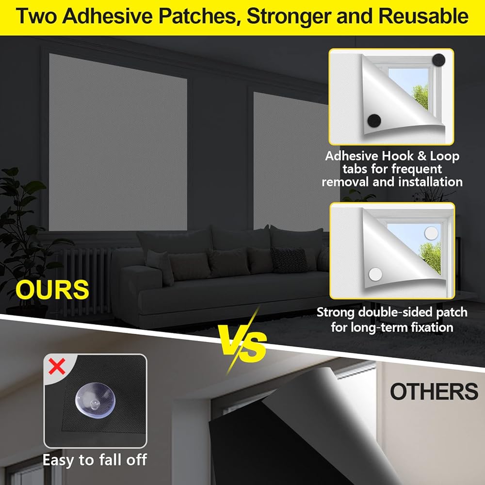 تركيب سهل في 3 خطوات: فقط قم بالقياس والقص واللصق - يتم ذلك في دقائق! تعمل ستائر التعتيم المحمولة مع الإعداد الحالي لديك، ولا حاجة للستائر أو القضبان أو الحفر. بمجرد عدم الحاجة إلى التعتيم، فقط قم بتقشيره وتخزينه في المرة القادمة