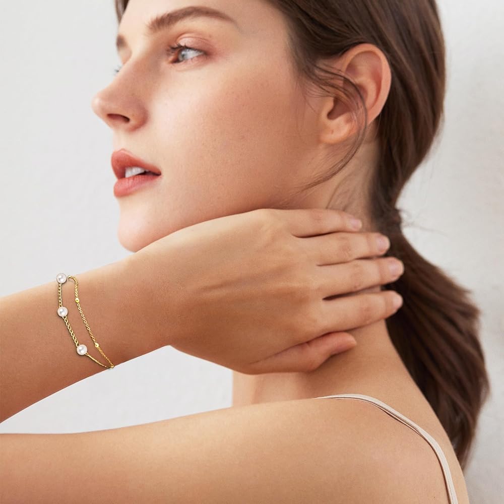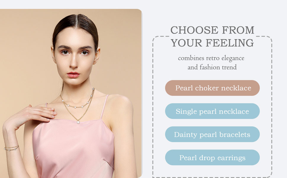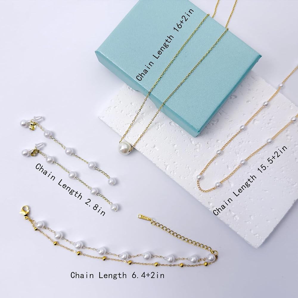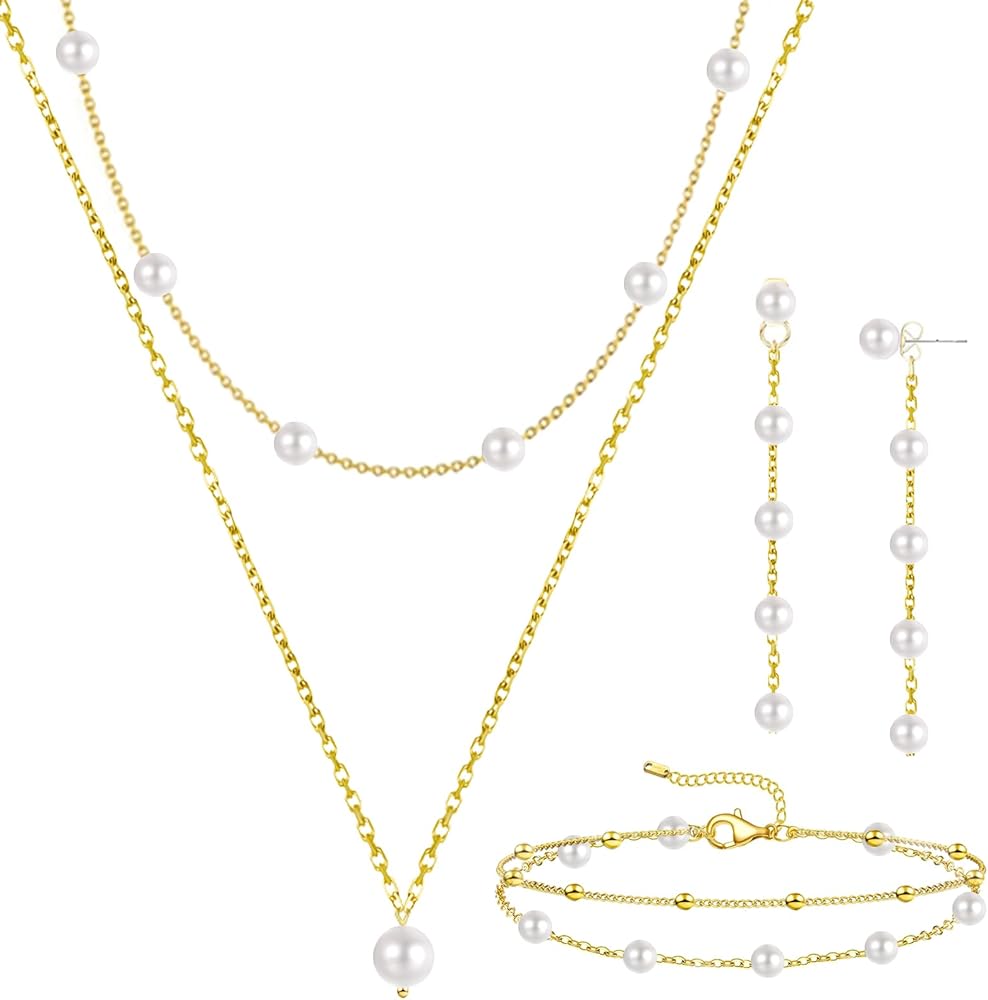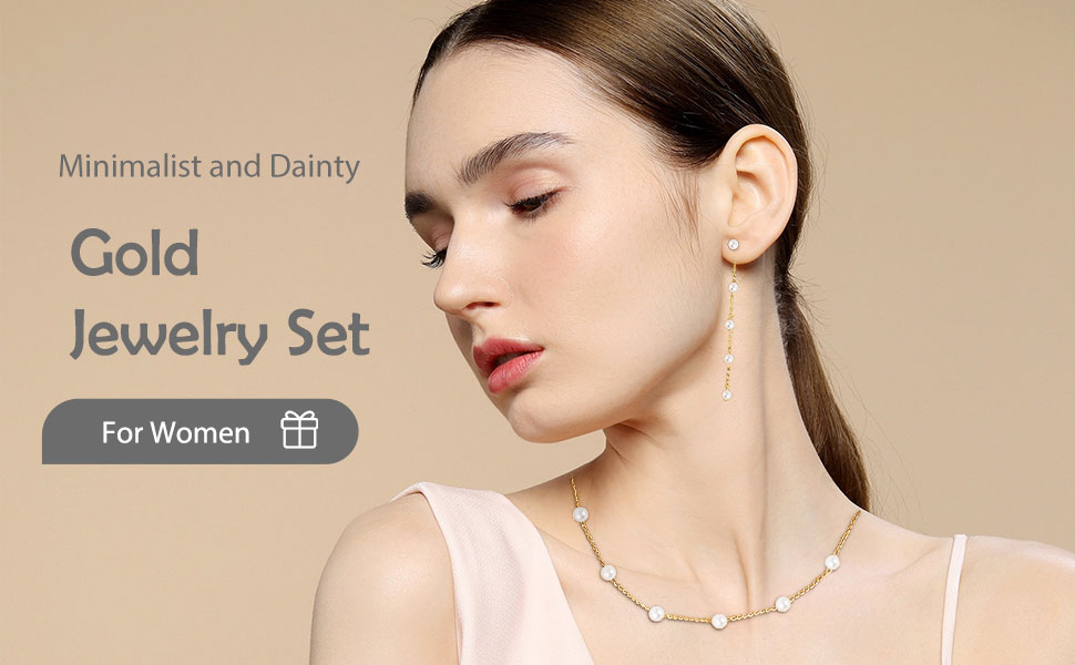 مجموعة مجوهرات ذهبية للنساء: تتضمن المجموعة عقدًا من اللؤلؤ وقلادة لؤلؤية واحدة بسيطة وأساور لؤلؤ أنيقة وأقراط متدلية بسيطة من اللؤلؤ. يمكنك ارتدائها جميعًا معًا أو بشكل منفصل. يجمع التصميم بين الأناقة القديمة وعناصر الموضة التي يمكن أن تضيف طرازًا أنيقًا وأنيقًا إلى أي ملابس