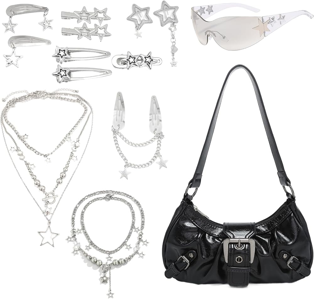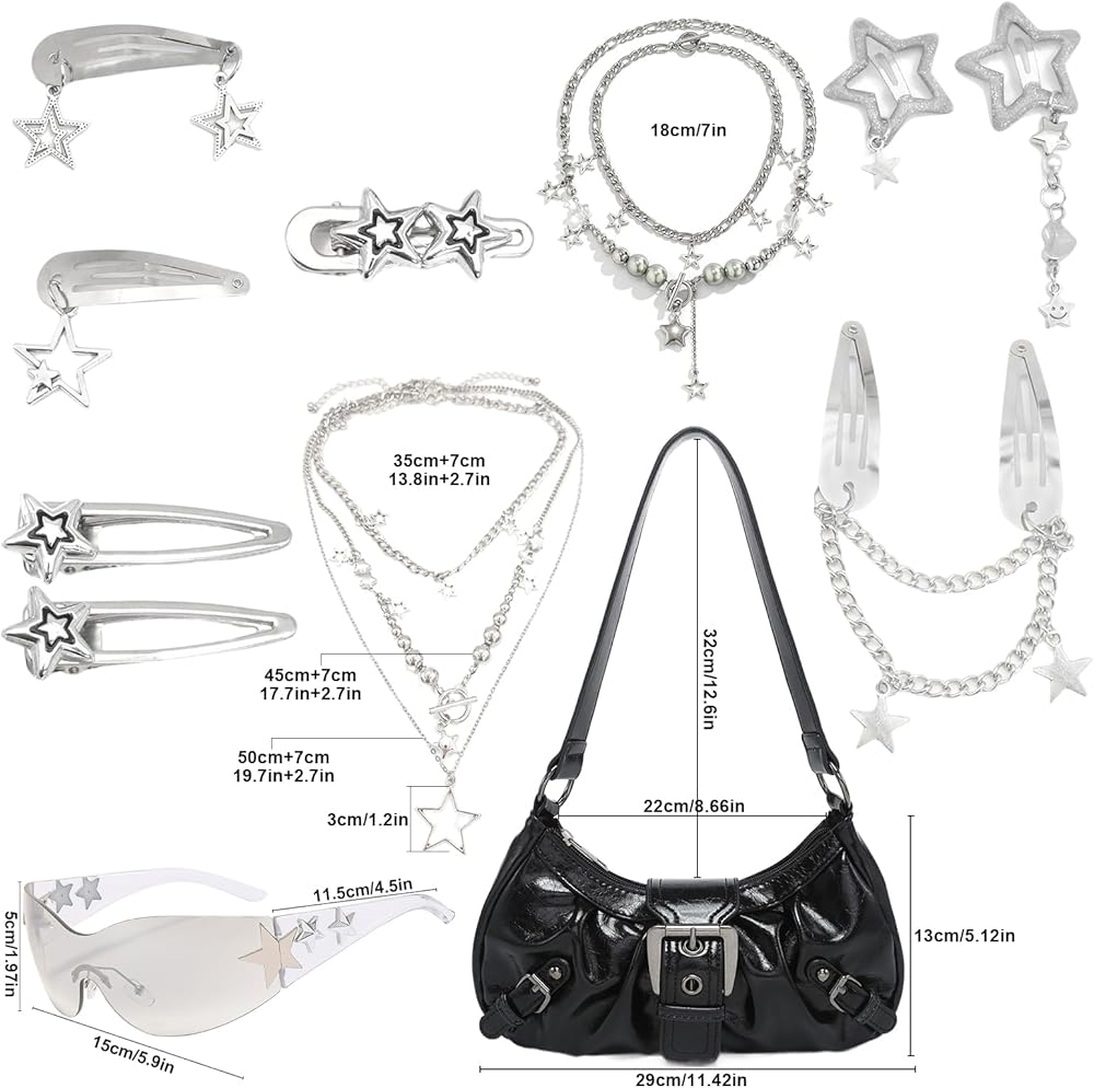 • Multifunction Bag Set:Suitable for daily wear,includes layered star Y2K silver necklace, Y2K star bracelets, Y2K sunglasses and metal star hairpins,embrace the iconic Y2K vibe with this vintage-inspired shoulder bag set, fit for expressing your distinctive style.