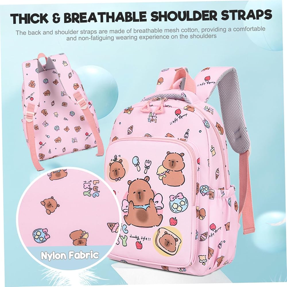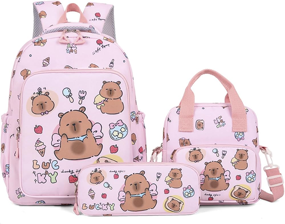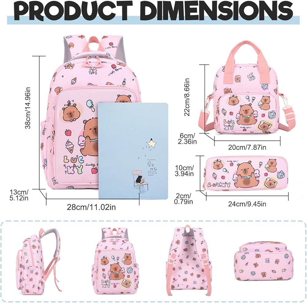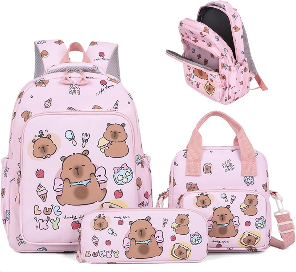 3Pcs/Set Capybara Backpack for Kids, Cute Kawaii Backpack Set with Lunch Bag and Pencil Case, Funny Going Out Cartoon Laptop Travel Bag combines adorable capybara-themed design with practical functionality for children; this kids backpack set includes a roomy backpack, insulated lunch bag, and matching pencil case, ideal for school and travel use; crafted with reliable, high-quality materials and featuring padded straps for comfort, it supports easy organization of school essentials and small laptops or tablets while reflecting a playful style perfect for young students; a perfect option for birthdays, back-to-school, or any special occasion, this kawaii capybara bag set brings fun and functionality to every outing and classroom day.
