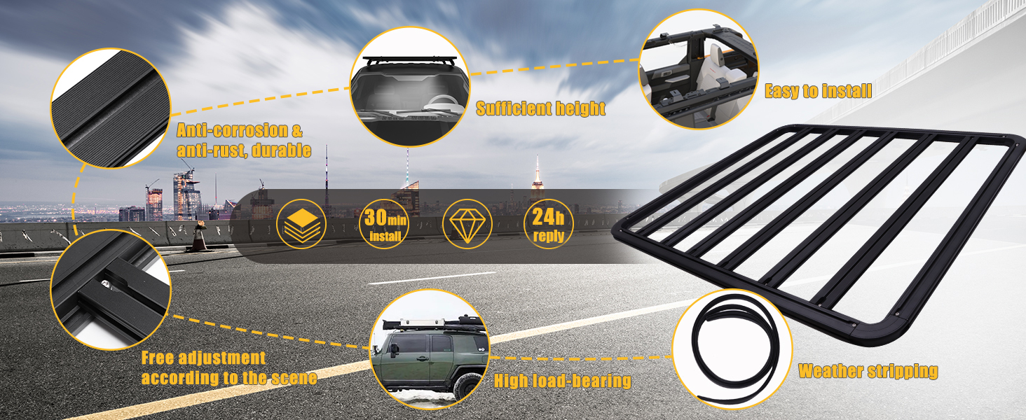تلبية مجموعة متنوعة من احتياجات الاستخدام: يمكن لسطح المنتج الأوسع أن يلبي احتياجاتك لحمل أشياء مختلفة، مثل قوارب الكاياك والدراجات والأمتعة وما إلى ذلك. إنها مناسبة لحملها عبر الجبال والممرات والشواطئ البحرية والطرق السريعة لتلبية احتياجاتك في الرحلات البرية والأرضية والطرق الوعرة.