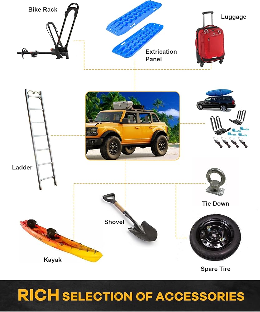 الملاءمة: منصة رف السقف تناسب 2021 2022 2023 2024 2025 Ford Bronco 4 أبواب بدون سطح صلب / سطح ناعم (غير مناسب لرياضة برونكو).