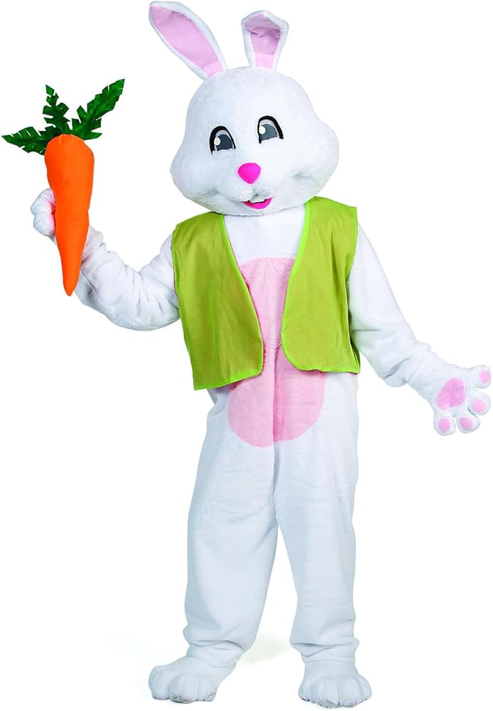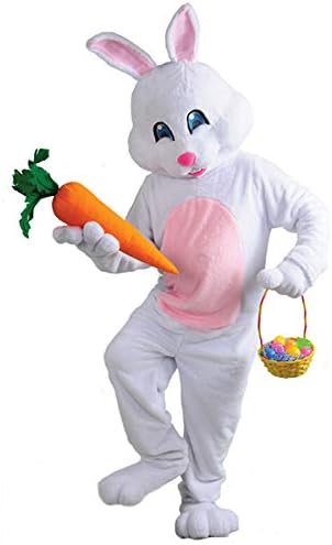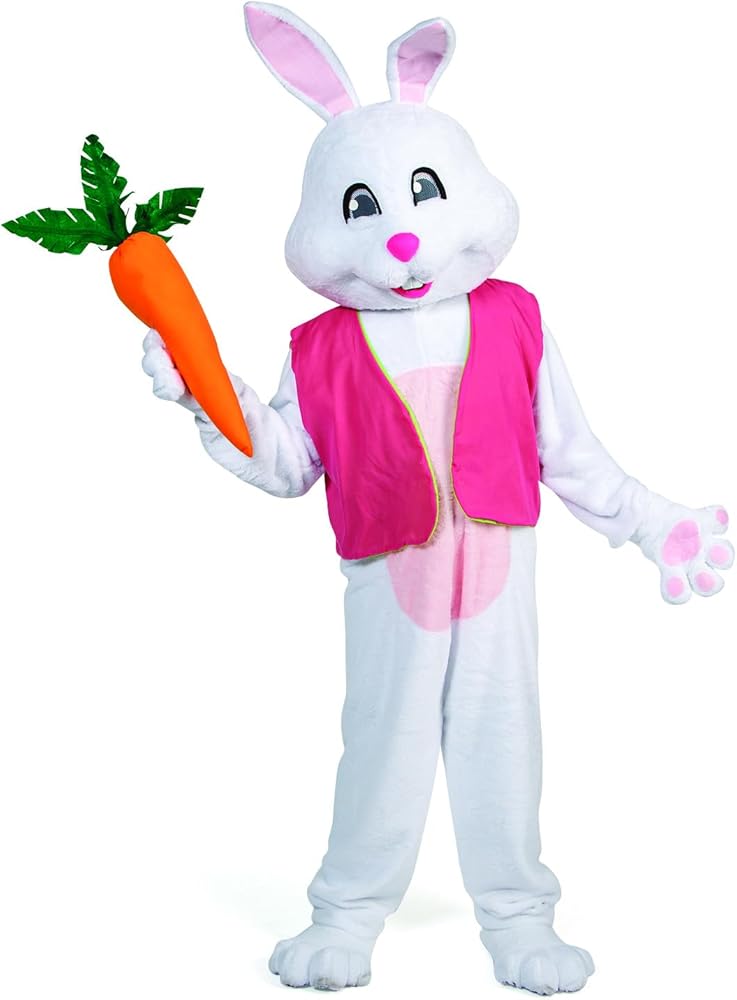 An Affordable Choice in Easter Costumes: Celebrate your Easter Party with a Professional Look! A Vibrant soft plush costume is a fun entertaining way to kick-off Spring! • Featuring an Easy to wear full body jumpsuit w/ oversized Bunny Head • Character Head has a foam rubber ring inside with cloth cap to secure head in place, allowing for natural movement • Masculine Eyes • Reversible Green/Pink Vest • Big Comfortable Gloves reaching 11 inches from wrist to finger tips • Fluffy Detachable Tail • 14in Foam Stuffed Feet w/ No Slip Sole • Long Soft Rabbit Ears reaching 13 inches tall • A Removable faux Flower • FREE Oversized Soft plush Carrot included Whether its making a lasting impression with guests, stirring up comments on social media, or promoting person events, this costume has it all! Bunny suit can be stored and reused providing years of entertainment. Easy assembly in just a few simple steps! Fits sizes up to 42 (Inseam length is approximately 31 inches, sleeve length from shoulder seam to wrist is 29 inches, with length from center back to wrist 39 inches) Care Instructions: Suit--Hand wash cold, line dry or dry clean. Do not bleach, do not tumble dry. Head-spot clean with damp sponge, and allow to dry. 100% polyester costume.