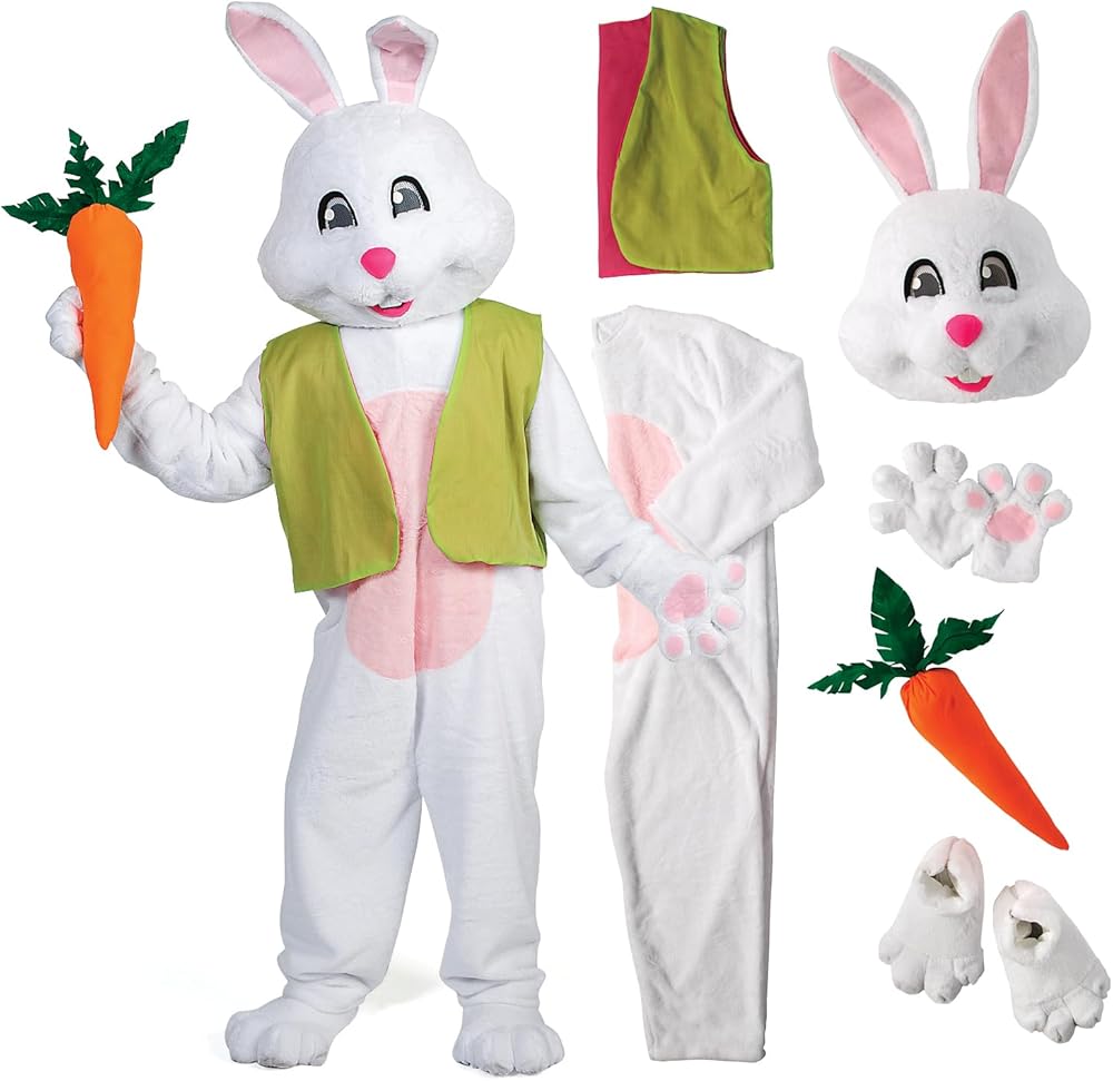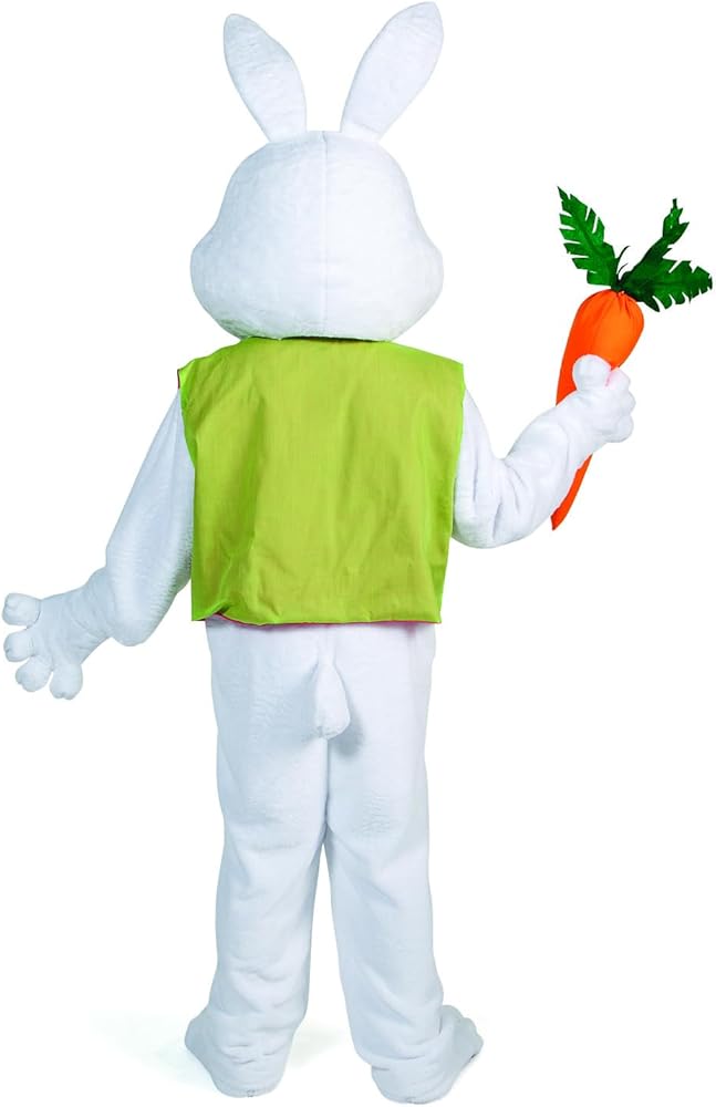 Includes oversized bunny head with ears, jumpsuit, reversible vest, gloves, detachable tail and plush carrot.