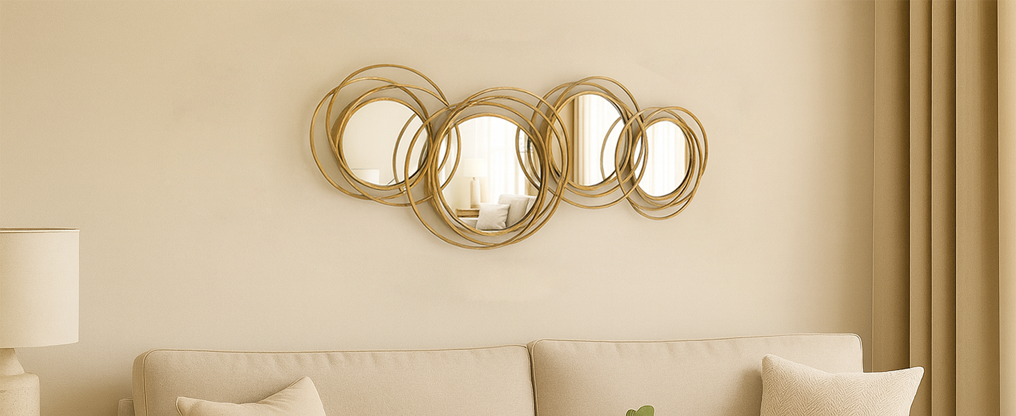 1️⃣ إطار من رقائق الذهب بلمسة نهائية يدوية، كل مرآة مصنوعة بلمسة نهائية من رقائق الذهب المطبقة يدويًا على مكواة متينة، مما يخلق ملمسًا معدنيًا غنيًا مع انعكاسات دقيقة ترفع من مستوى أي ديكور منزلي حديث.
