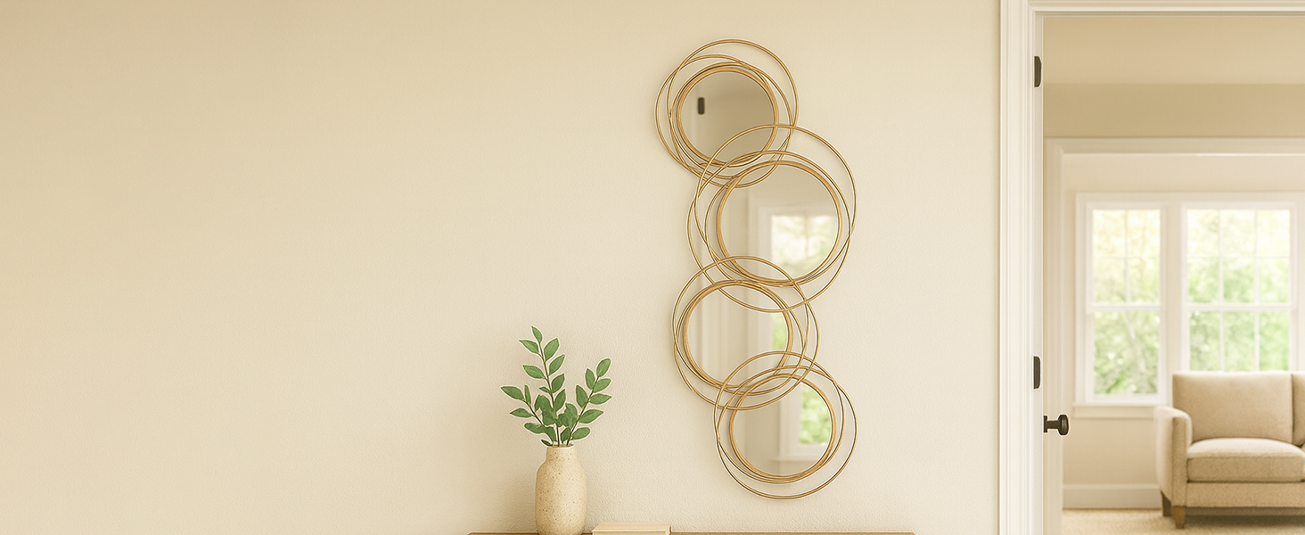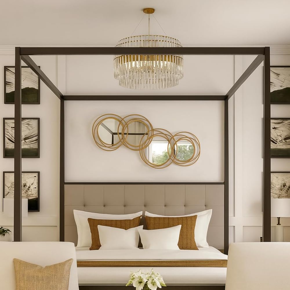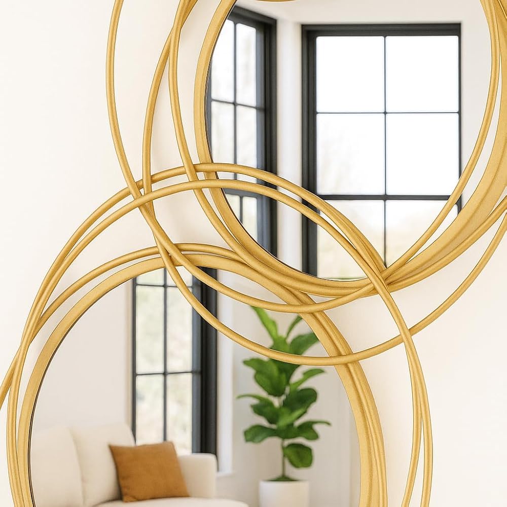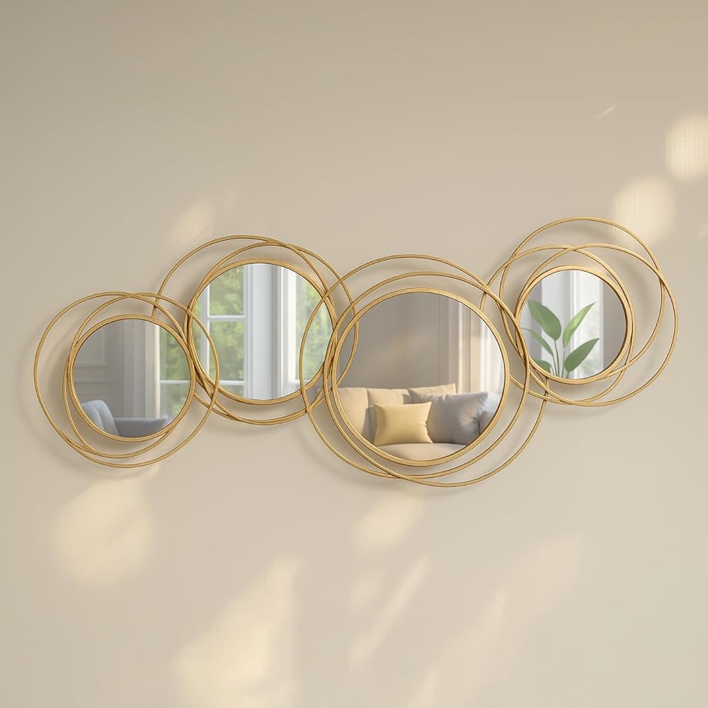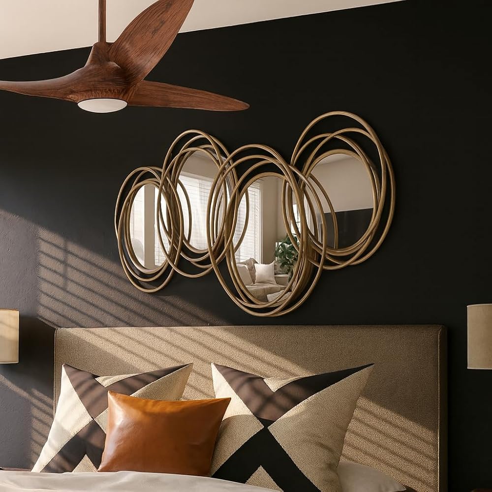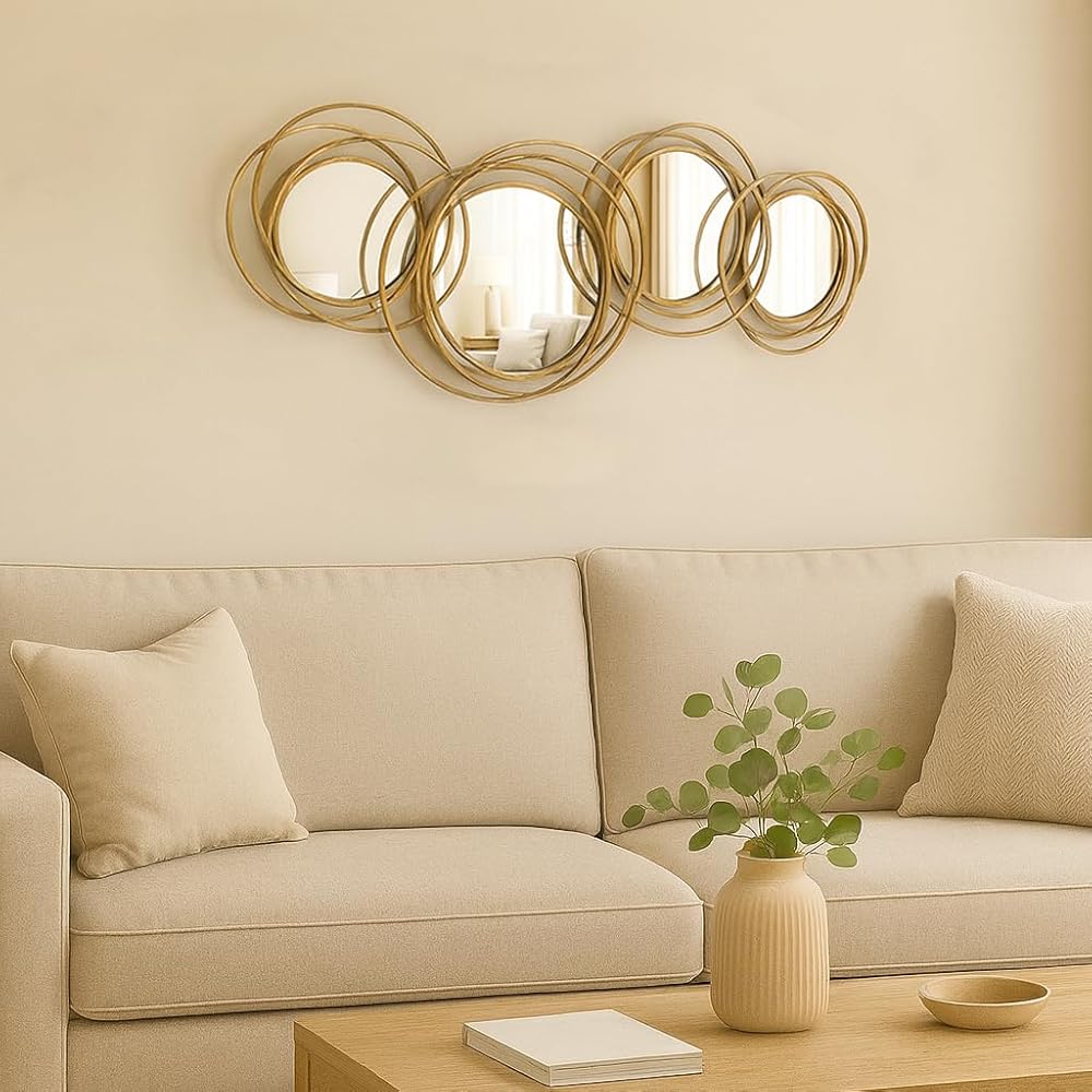 2️⃣ تناسب غرفة المعيشة أو المدخل أو غرفة النوم. مثالية لغرف المعيشة أو الممرات أو غرف النوم، حيث تجلب مرآة الحائط الذهبية الأنيقة هذه الدفء والعمق إلى مساحتك بينما تجعل الغرف الأصغر تبدو أكثر إشراقًا وأكبر.