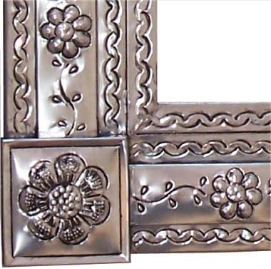 This silver tin mirror has the frame fully decorated with flowers connected by a bower, embossed from the main body in a rectangular pattern. Each side is joined together on each corner by a squared tin box, which has by itself a embossed tin flower. Along the frame and the glass mirror, it is punched with waved dotted lines. These decorations are known as punched tin. This mirror will delight your home decor, as a rustic accent. It will fit any dressing area such as your bathroom or a hallway. A piece of art that you will be delighted with, and proud to hang it on your walls. It will hang either vertically or horizontally. The frame itself is a little bit over 5 wide, so the glass itself is about 13.5" wide by 17.5" tall."