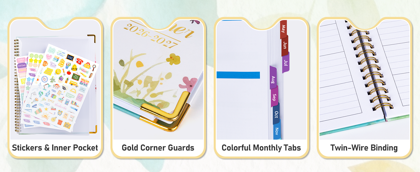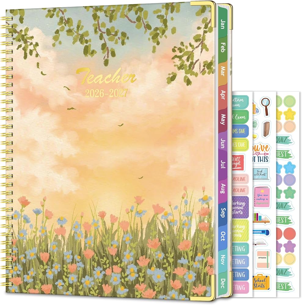 جودة موثوقة: يتميز دفتر المعلم ذو الغلاف الصلب بسلك مزدوج متين ومسطح | زوايا معدنية | ورق غير قابل للنزف 100 جرام في المتر المربع | 12 قرص شهري مقاوم للماء | الجيب الداخلي | ملصقات. يعد مخطط المدرسة المنزلية مثاليًا لتخطيط الدروس وإدارة الفصول الدراسية.