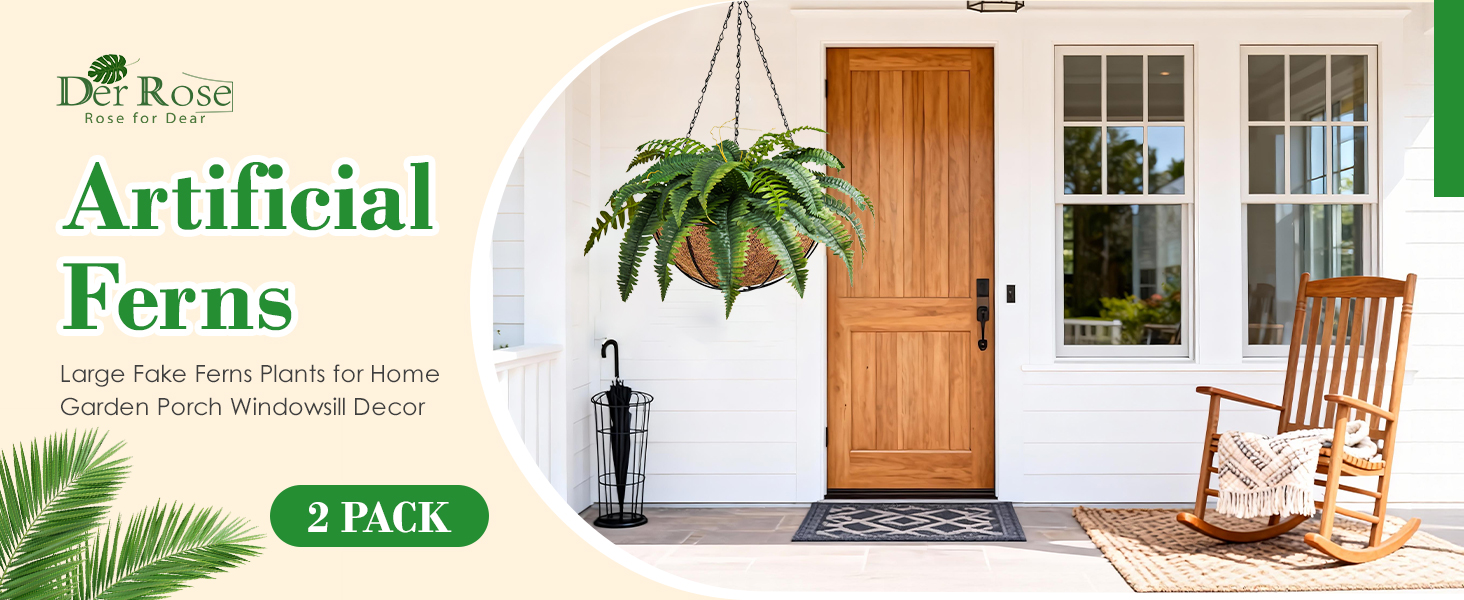 دير روز 45 "السرخس وهمية النباتات الاصطناعية الكبيرة في الهواء الطلق مجموعة من 2 نباتات السرخس بوسطن الاصطناعية مقاومة للأشعة فوق البنفسجية مع 60 سعفة لديكور المنزل والحديقة والشرفة