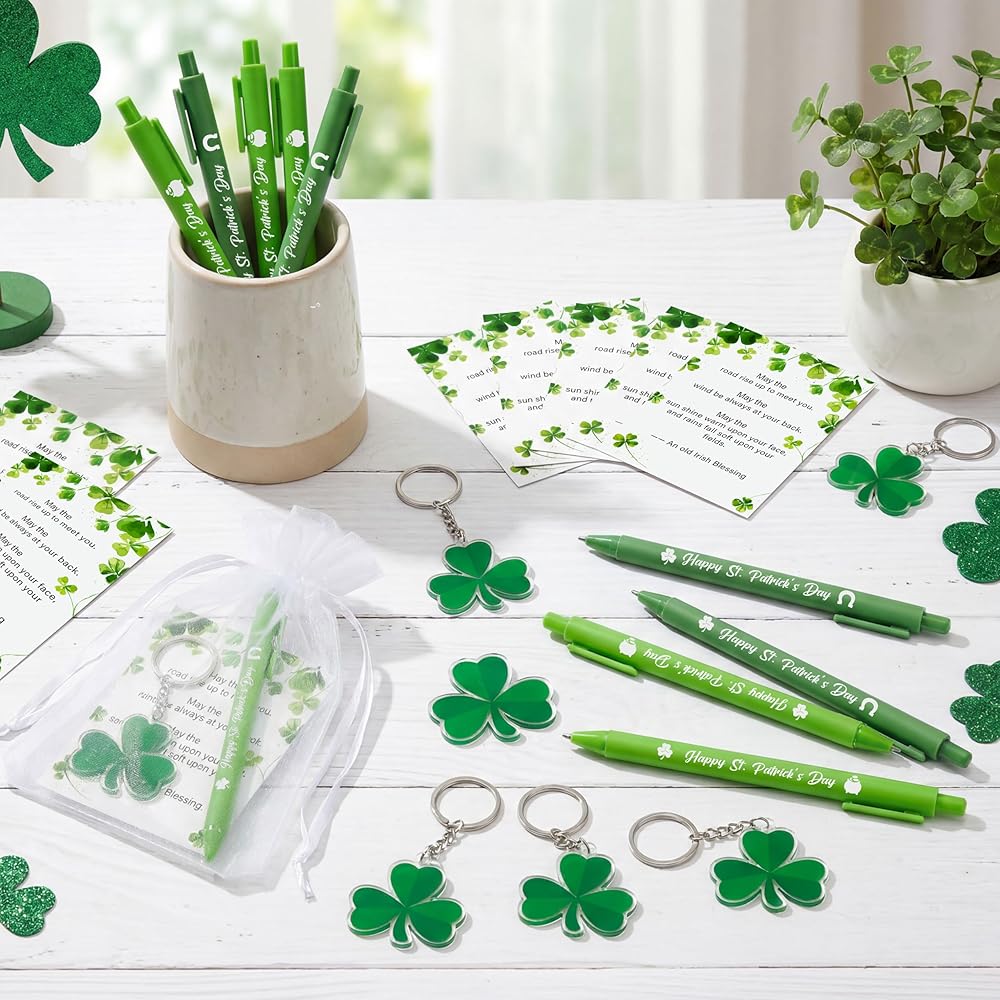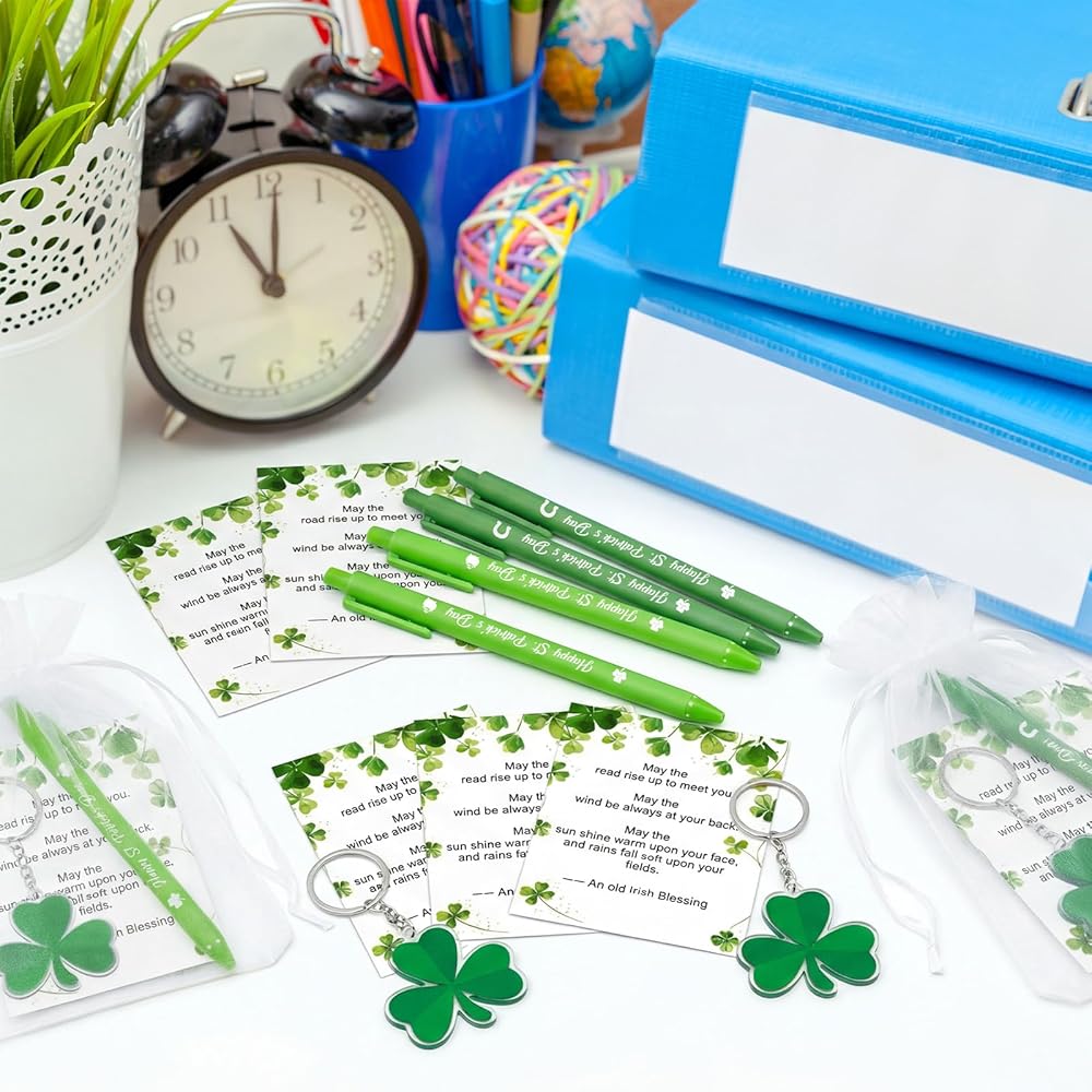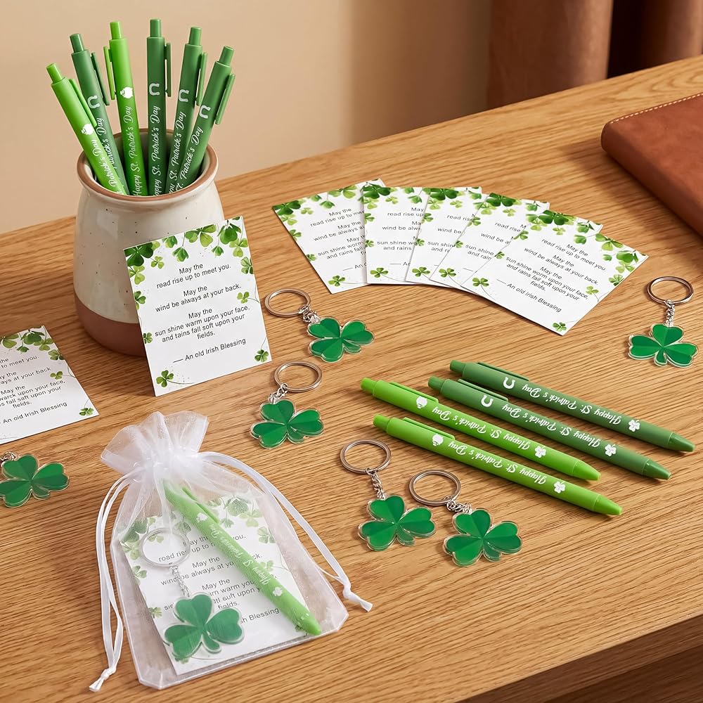 • مجموعة هدايا عيد القديس باتريك: تتضمن مجموعة هدايا عيد القديس باتريك هذه 18 قطعة من أقلام الحبر الأخضر بالحبر الأسود، و18 قطعة من البطاقات بالمباركة الأيرلندية، و18 قطعة من حلقات المفاتيح على شكل نبات النفل و18 قطعة من أكياس الرباط من الأورجانزا؛ هدية قرطاسية ملونة ومبهجة تضفي لمسة من روح العطلة على حياتك اليومية