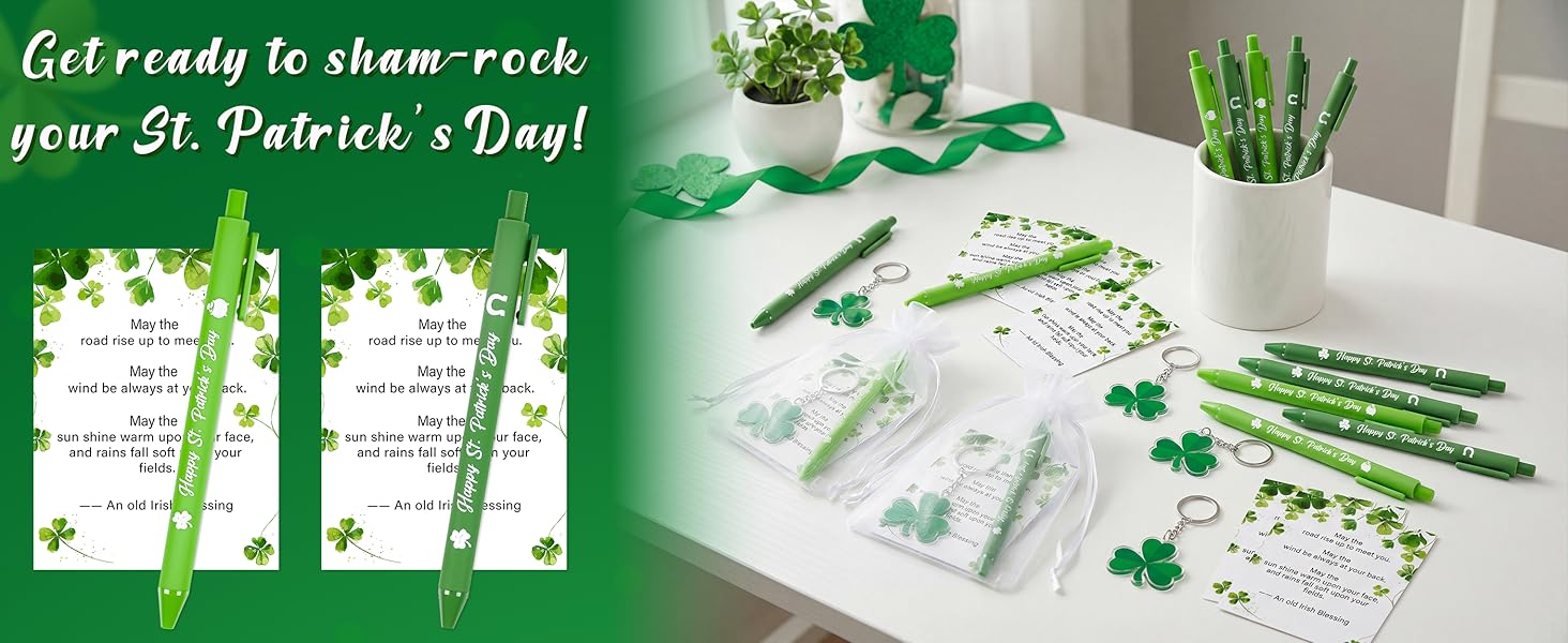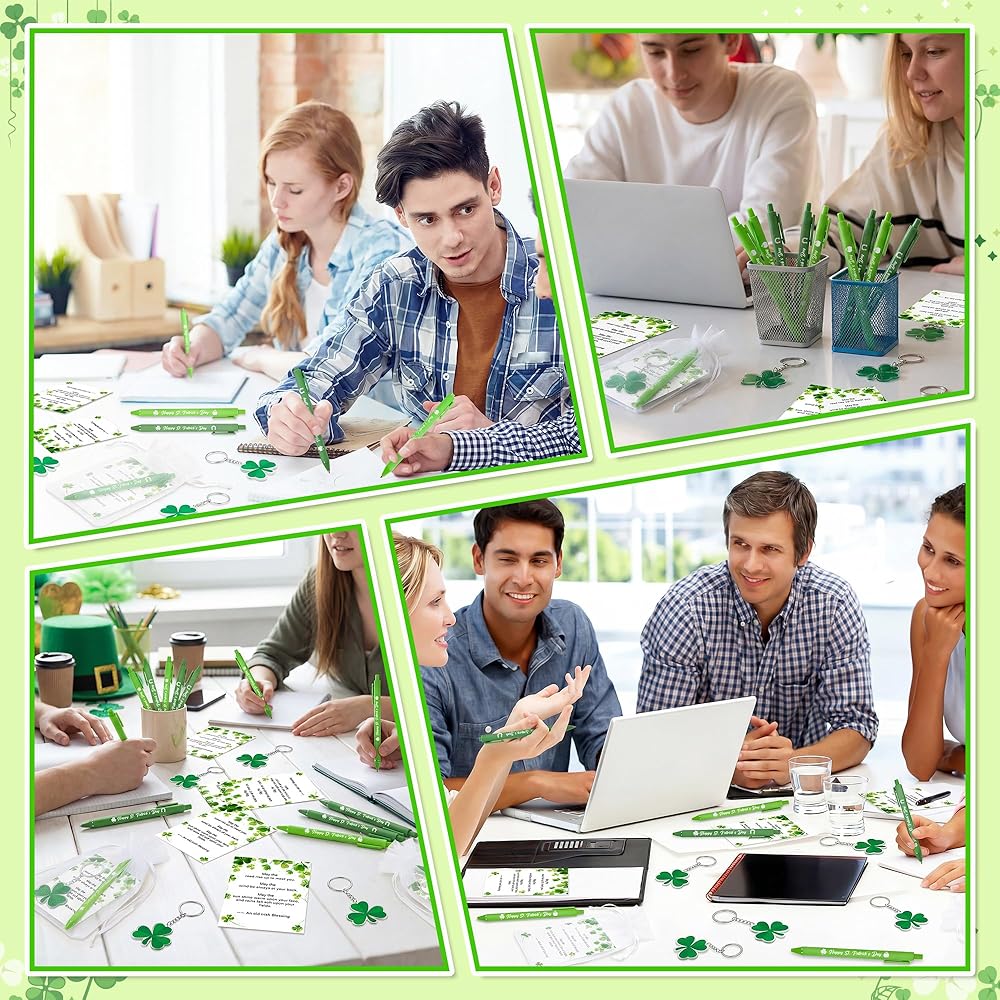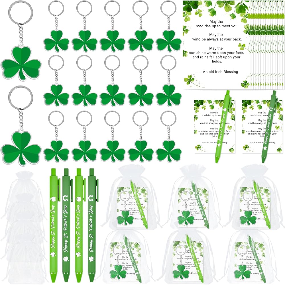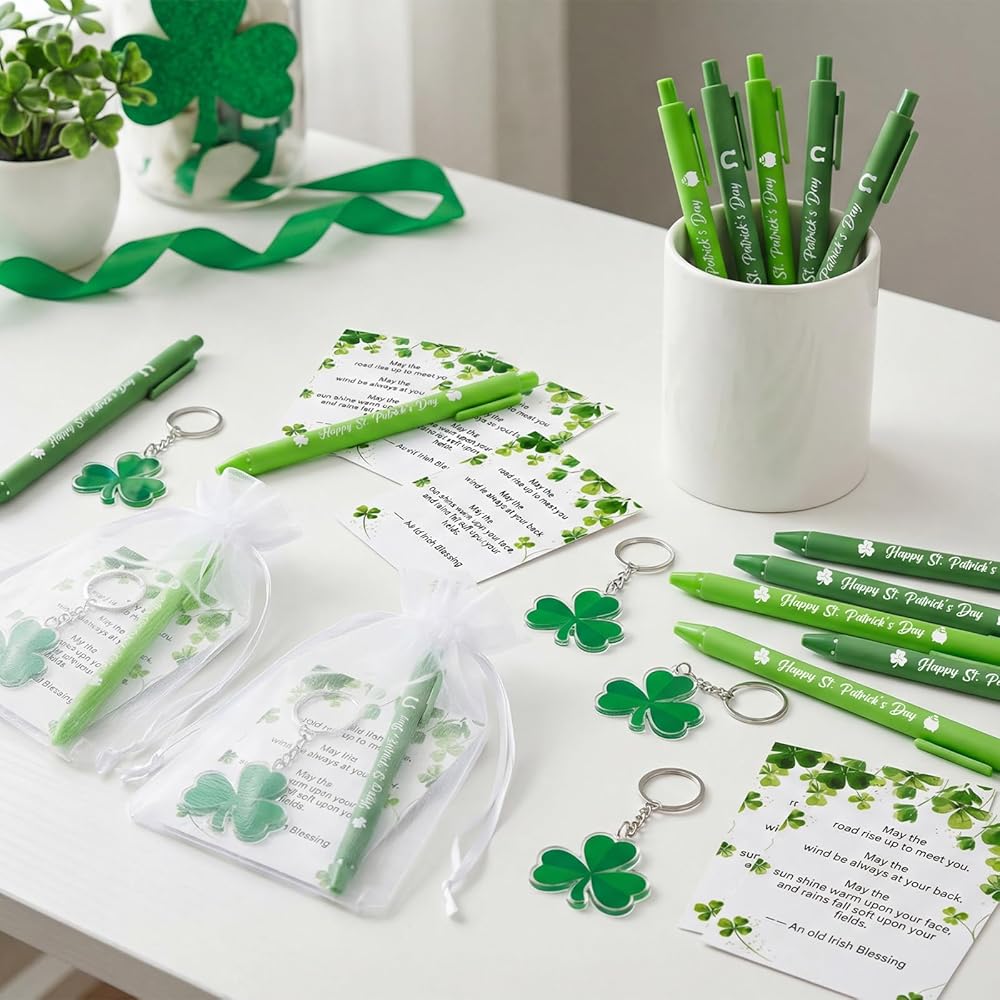 • مجموعة هدايا عيد القديس باتريك: تتضمن مجموعة هدايا عيد القديس باتريك هذه 18 قطعة من أقلام الحبر الأخضر بالحبر الأسود، و18 قطعة من البطاقات بالمباركة الأيرلندية، و18 قطعة من حلقات المفاتيح على شكل نبات النفل و18 قطعة من أكياس الرباط من الأورجانزا؛ هدية قرطاسية ملونة ومبهجة تضفي لمسة من روح العطلة على حياتك اليومية