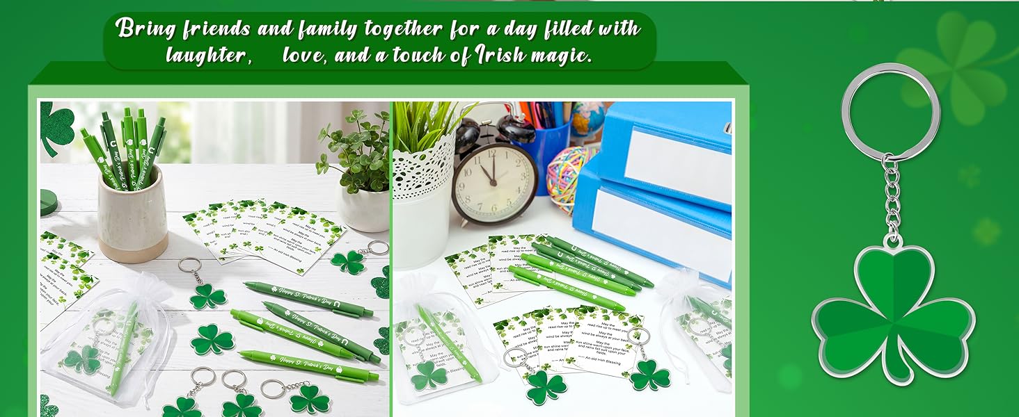 • حجم سهل الحمل: يبلغ مقاس كل قلم حوالي 5.75 سم؛ يبلغ مقاس كل بطاقة حوالي 3.11 سم × 4.05 سم؛ يبلغ مقاس كل حلقة مفاتيح شامروك حوالي 1.77 سم × 1.57 سم؛ مما يجعلها سهلة التعبئة في حقائب الهدايا أو حقائب الهدايا.