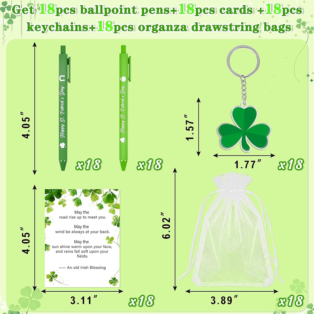 18 مجموعة من هدايا عيد القديس باتريك للبالغين، أقلام حبر جاف سانت باتريك الخضراء ملحقات سلسلة مفاتيح شامروك، بطاقات نعمة أيرلندية، حشوات حقائب الهدايا للمكتب، لوازم حفلات أعياد الميلاد