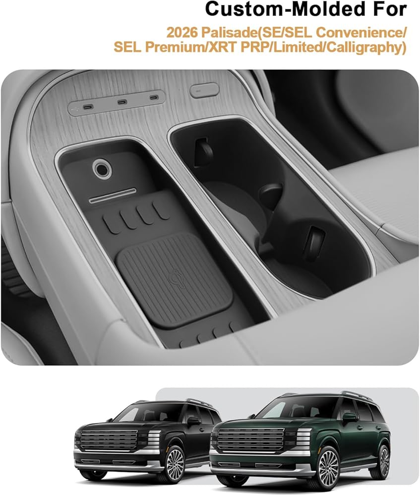[Custom Fit for 2026 Hyundai Palisade] Designed specifically for the 2026 Hyundai Palisade(SE/SEL Convenience/SEL Premium/XRT PRP/Limited/Calligraphy) & 2026 Palisade Hybrid(SEL/SEL Premium/Limited/Calligraphy), this silicone cup holder insert and wireless charging pad set fits perfectly with the original center console, ensuring a seamless OEM-style look and secure placement without shifting.