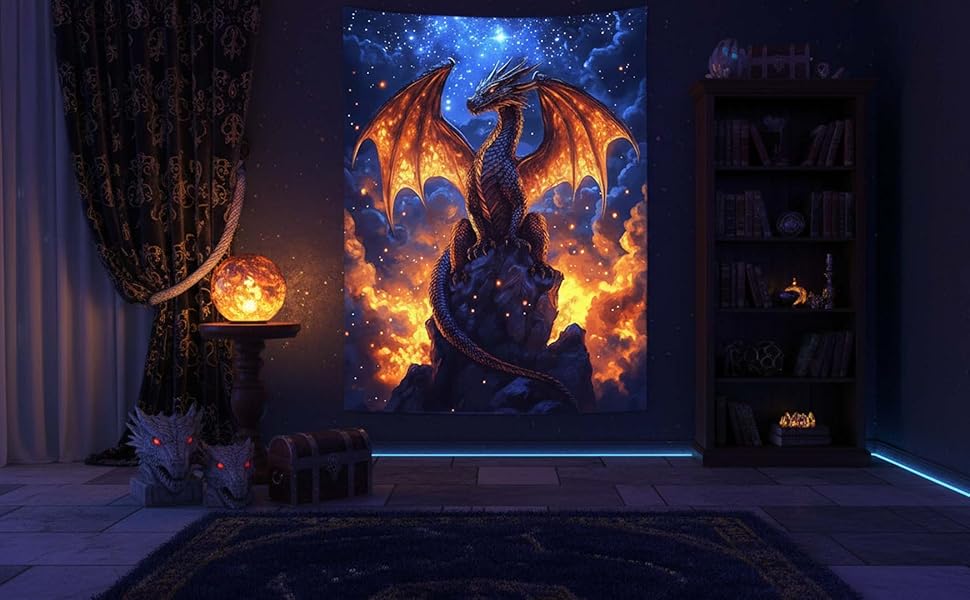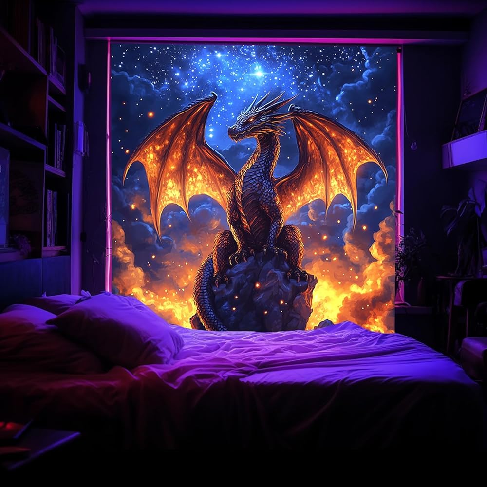 موضوع حالم: يتميز هذا النسيج بتصميم تنين أسود فاتح ساحر، مثالي لمحبي الخيال والجمال القوطي. خصائصه التفاعلية للأشعة فوق البنفسجية تجعله يتوهج تحت الضوء الأسود، مما يضيف إحساسًا بالغموض إلى أي غرفة.