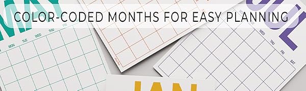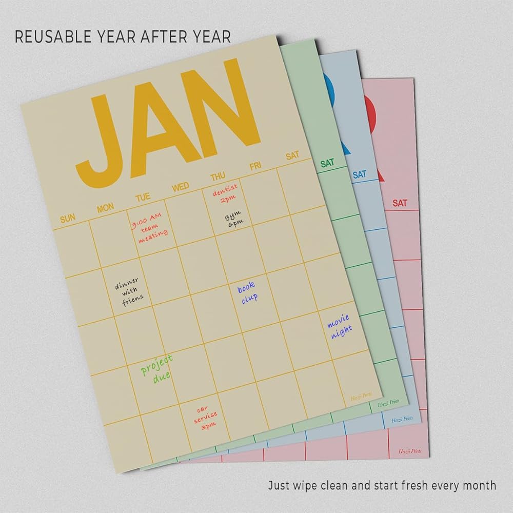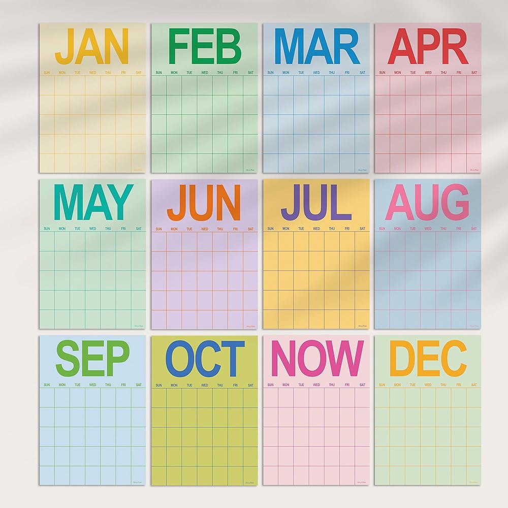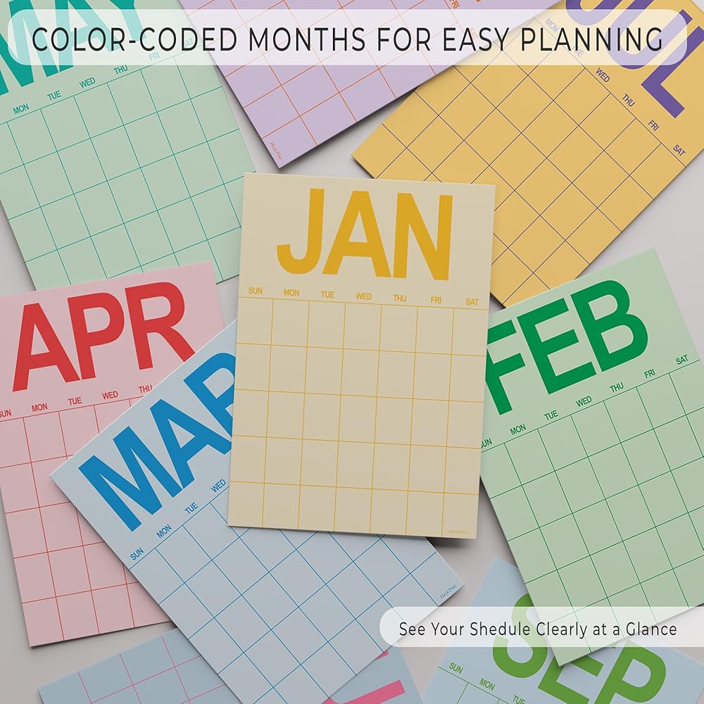 مجموعة كاملة لمدة 12 شهرًا: تتضمن جميع التقويمات الشهرية الملونة الـ 12 (من يناير إلى ديسمبر) مع رؤوس جريئة وسهلة القراءة وتصميمات مرمزة بالألوان لتنظيم بصري سريع ووضوح التخطيط