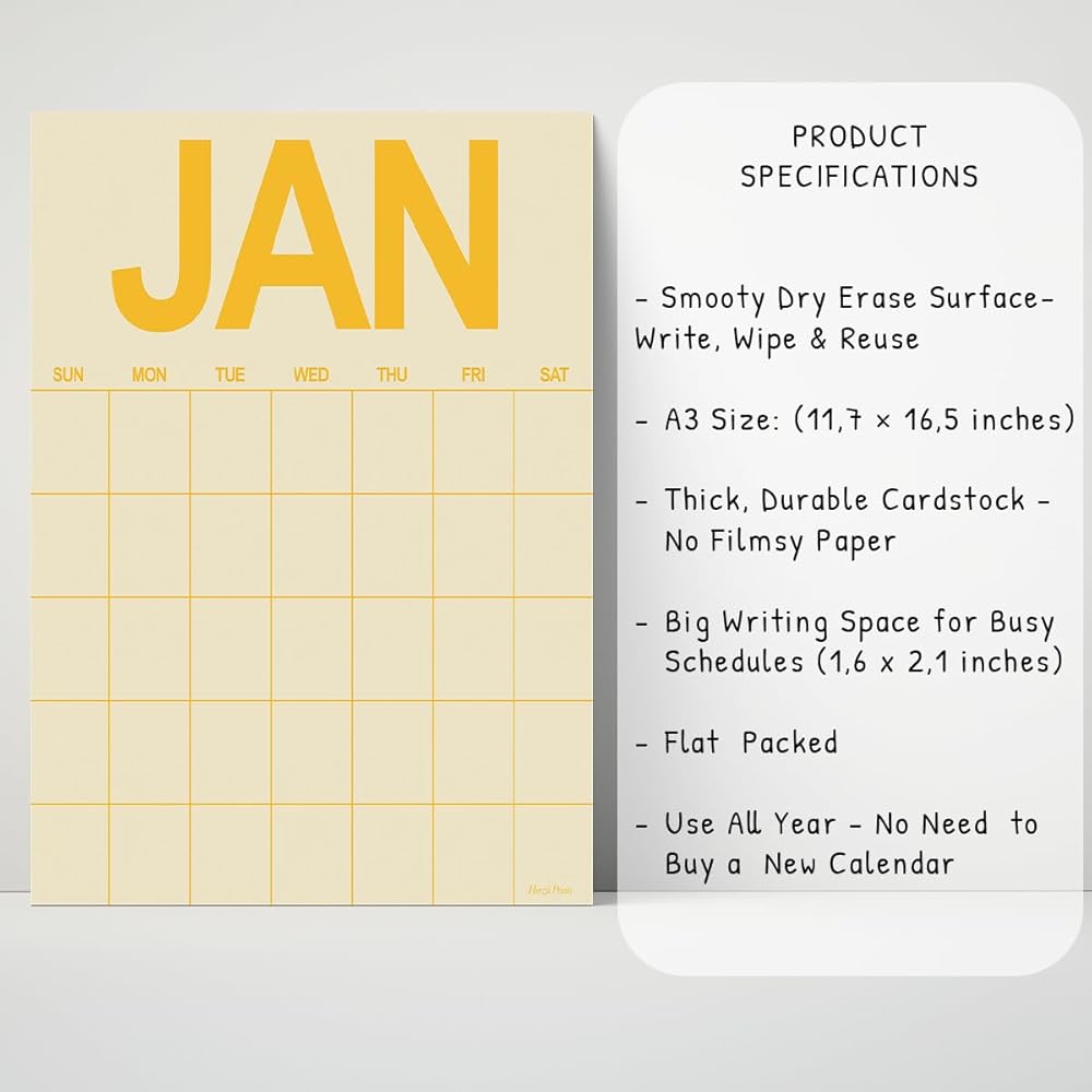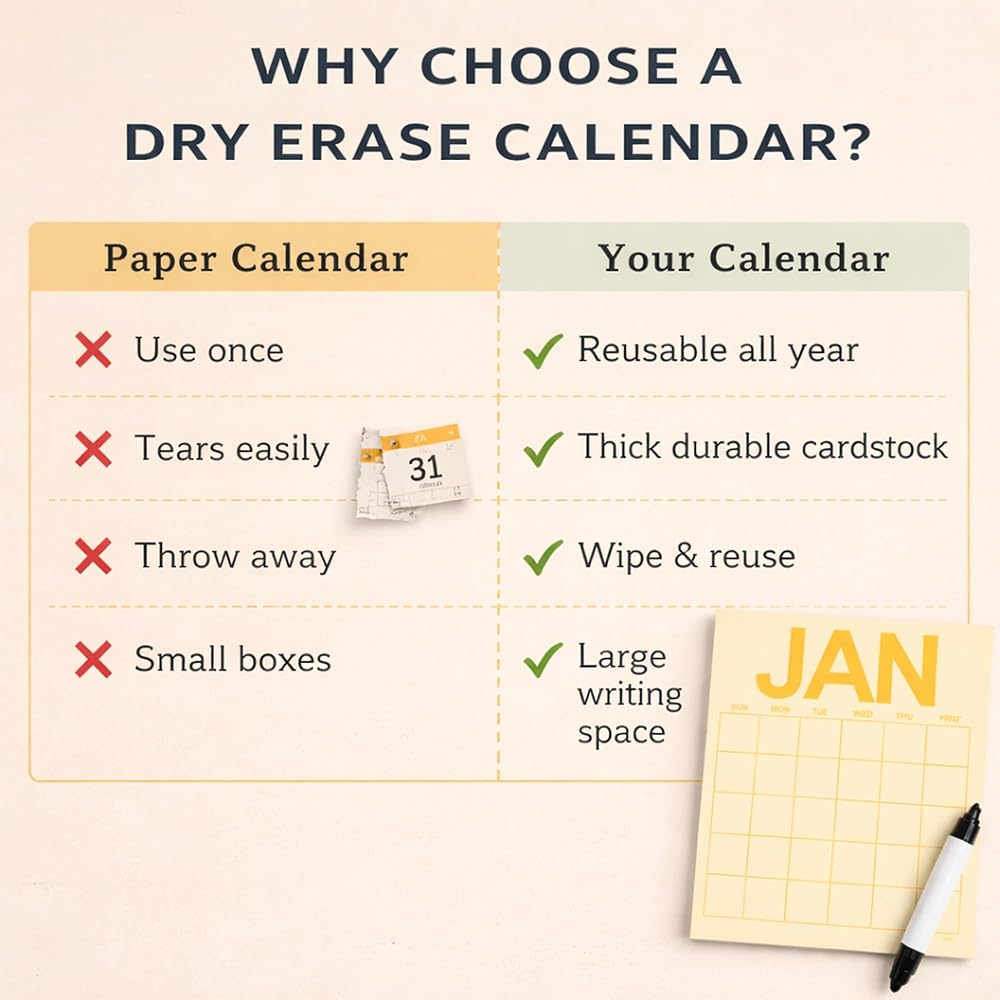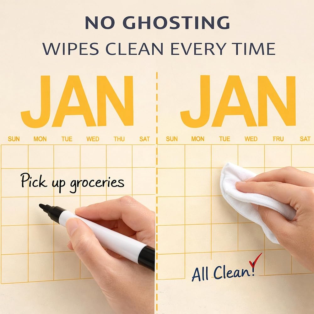 سطح جاف قابل لإعادة الاستخدام: لمسة نهائية مصقولة ناعمة تسمح لك بالكتابة والتنظيف بالمسح وإعادة الاستخدام شهرًا بعد شهر دون الظلال أو البقع، مما يلغي الحاجة إلى شراء تقويمات جديدة كل عام.