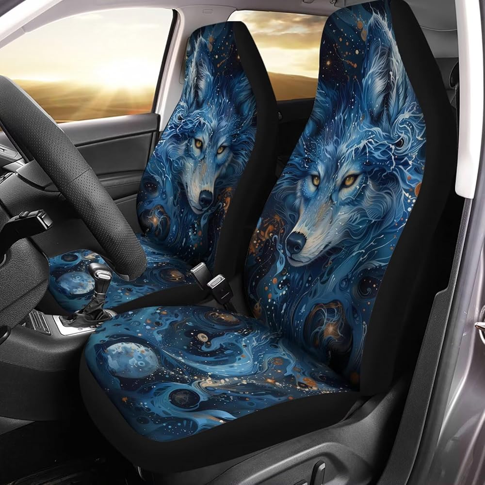 أغطية مقاعد السيارة مقاومة للماء للأمام، قطعتان من أغطية مقاعد السيارة المرنة العالمية بطباعة الذئب الأزرق، ملحقات الحماية الداخلية للسيارات للنساء in Kuwait