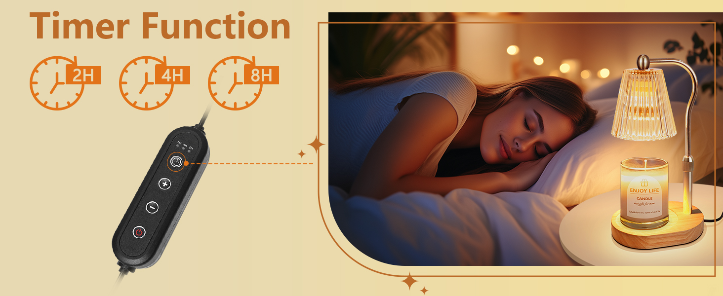 سخان شمع كهربائي مزود بمؤقت. يتميز جهاز تسخين ذوبان الشمع هذا بوظيفة التوقيت. ثلاثة خيارات للمؤقت لمدة 2 و4 و8 ساعات تجعل من السهل إغلاق الشمعة الأكثر دفئًا. لا مزيد من القلق بشأن نسيان إطفاء الشموع المضيئة، فهي أكثر أمانًا في الاستخدام.