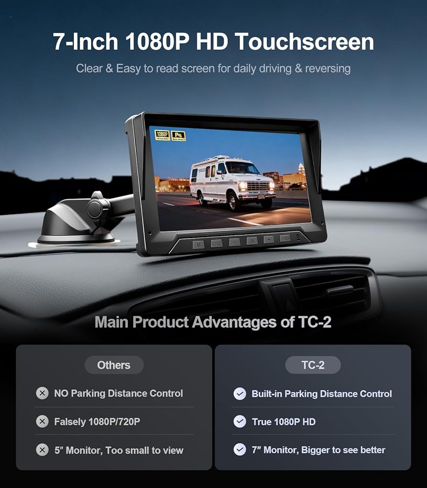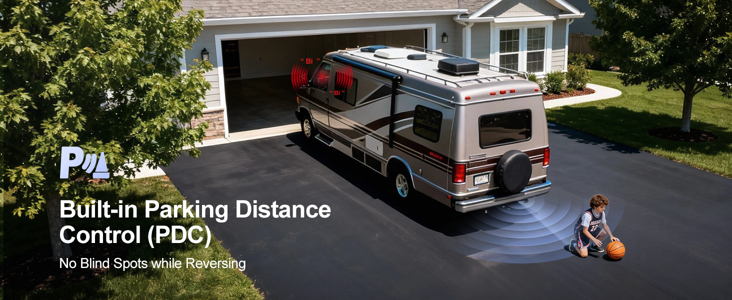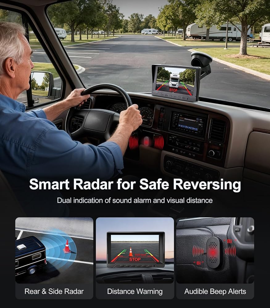 【مستشعر النسخ الاحتياطي الذكي】الكاميرا الاحتياطية TC-2 مجهزة بنظام التحكم في مسافة ركن السيارة (PDC). عند الرجوع للخلف، إذا تم اكتشاف عوائق أو مشاة على مسافة 3 أمتار، فسيصدر صفارة الرادار إنذارًا على الفور؛ كلما اقتربت المسافة، كلما كان المنبه أسرع، وسوف يرن المنبه بشكل مستمر عندما تقل المسافة إلى 0.5 متر. مصمم خصيصًا للمركبات الكبيرة مثل المركبات الترفيهية والمقطورات والشاحنات، فهو يوفر أمانًا عكسيًا أكثر موثوقية.