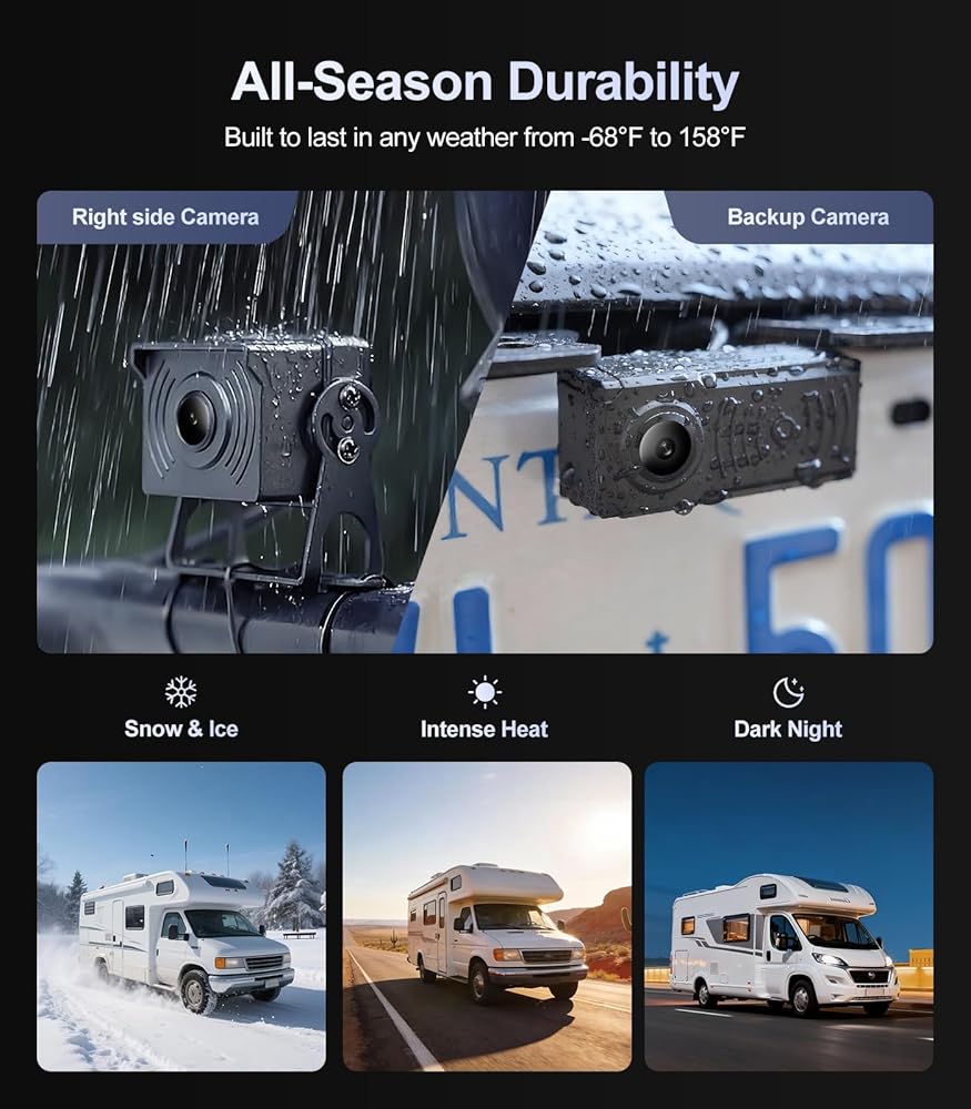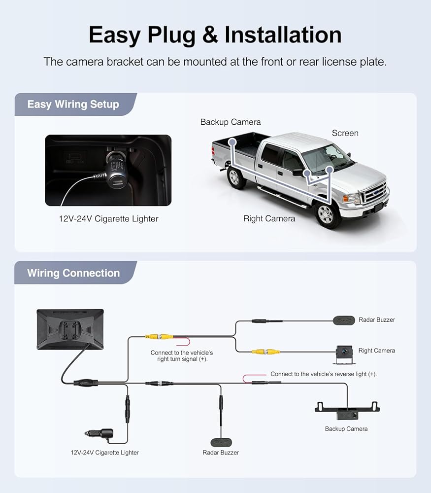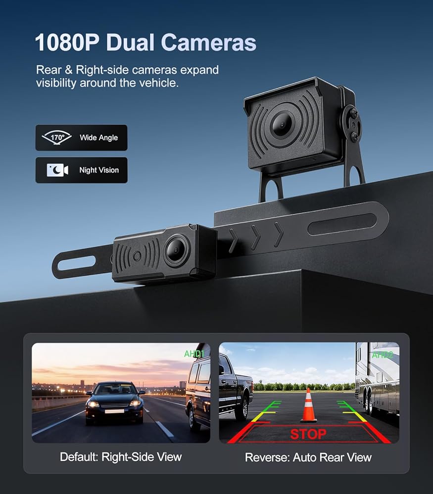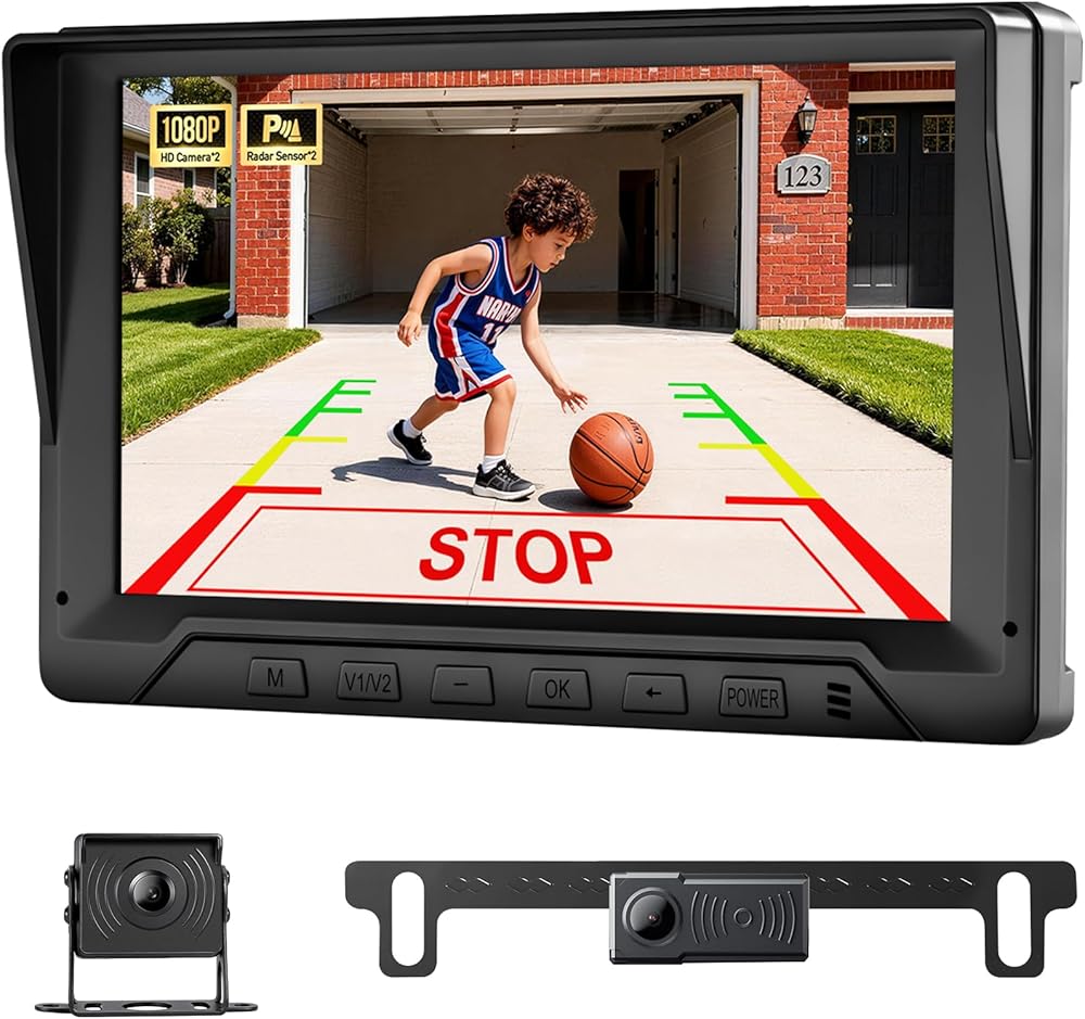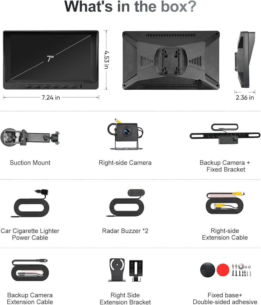 كاميرا احتياطية 1080 بكسل مع أجهزة استشعار احتياطية للتحكم في مسافة ركن السيارة (PDC) + مستشعر رادار للبقع العمياء على الجانب الأيمن، كاميرا احتياطية مع شاشة 7 بوصة للسيارات/الشاحنة/RV/المقطورة (الكاميرا الخلفية + الكاميرا اليمنى)