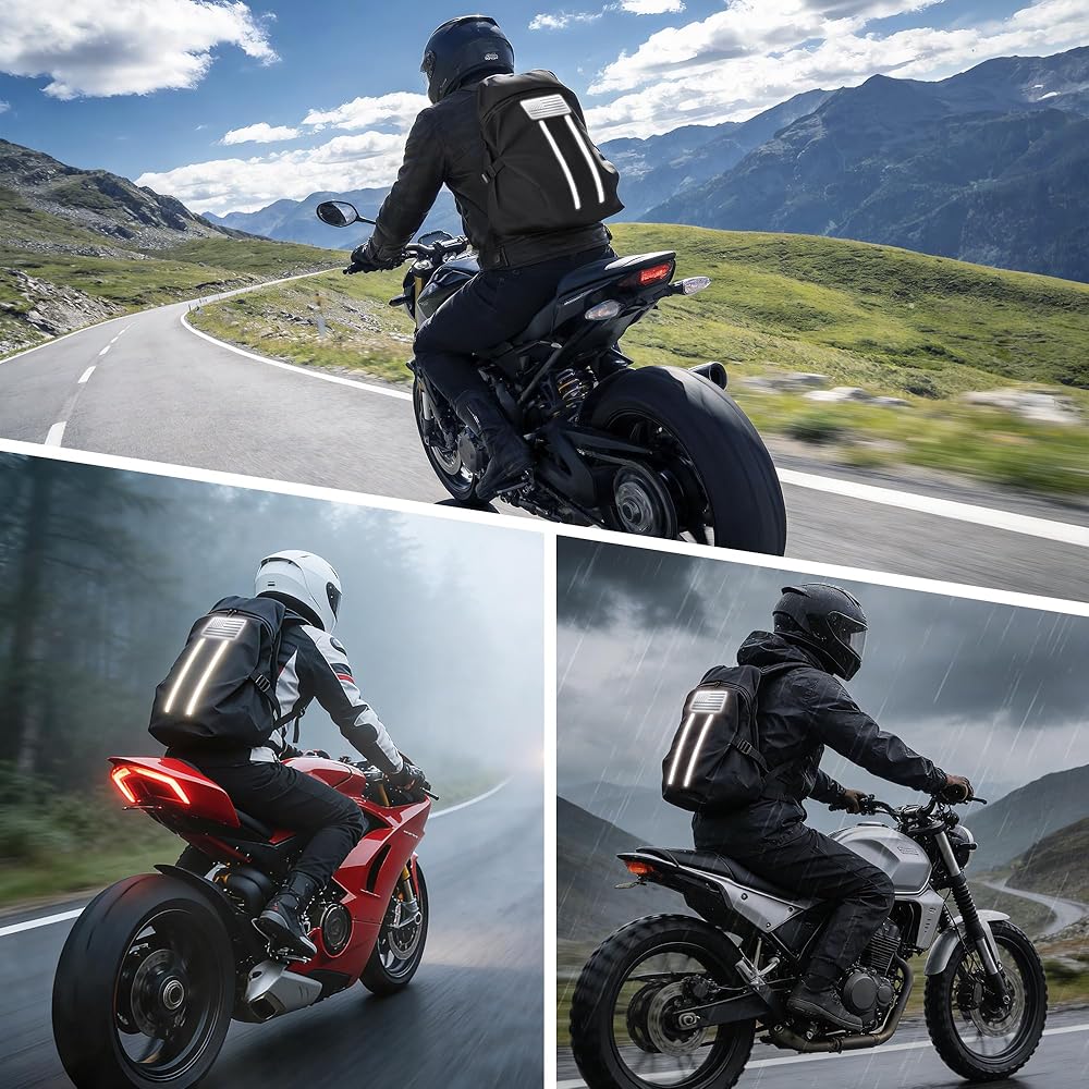 ركوب آمن وتصميم عاكس: تم تصميم حقيبة الدراجة النارية هذه بأشرطة عاكسة عالية الوضوح وشعار العلم العاكس، مما يعزز الرؤية في الليل أو في الإضاءة المنخفضة لركوب آمن. هيكل خفيف الوزن لا يجلب أي عبء إضافي أثناء رحلتك.