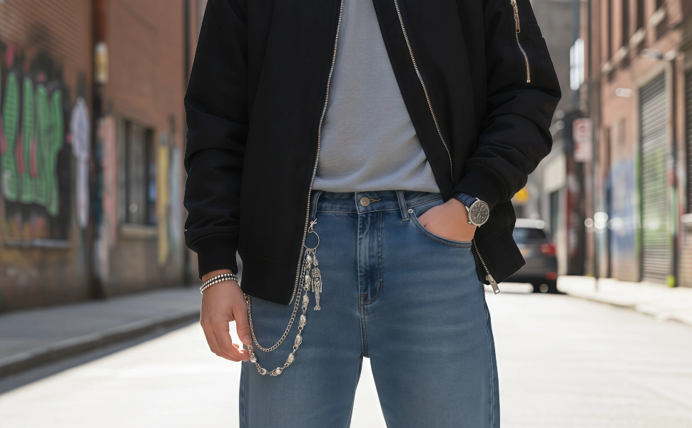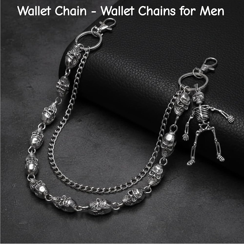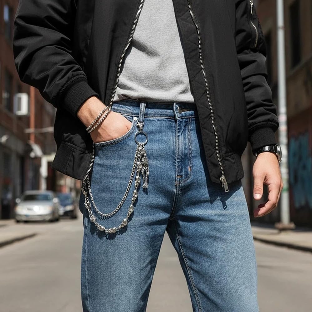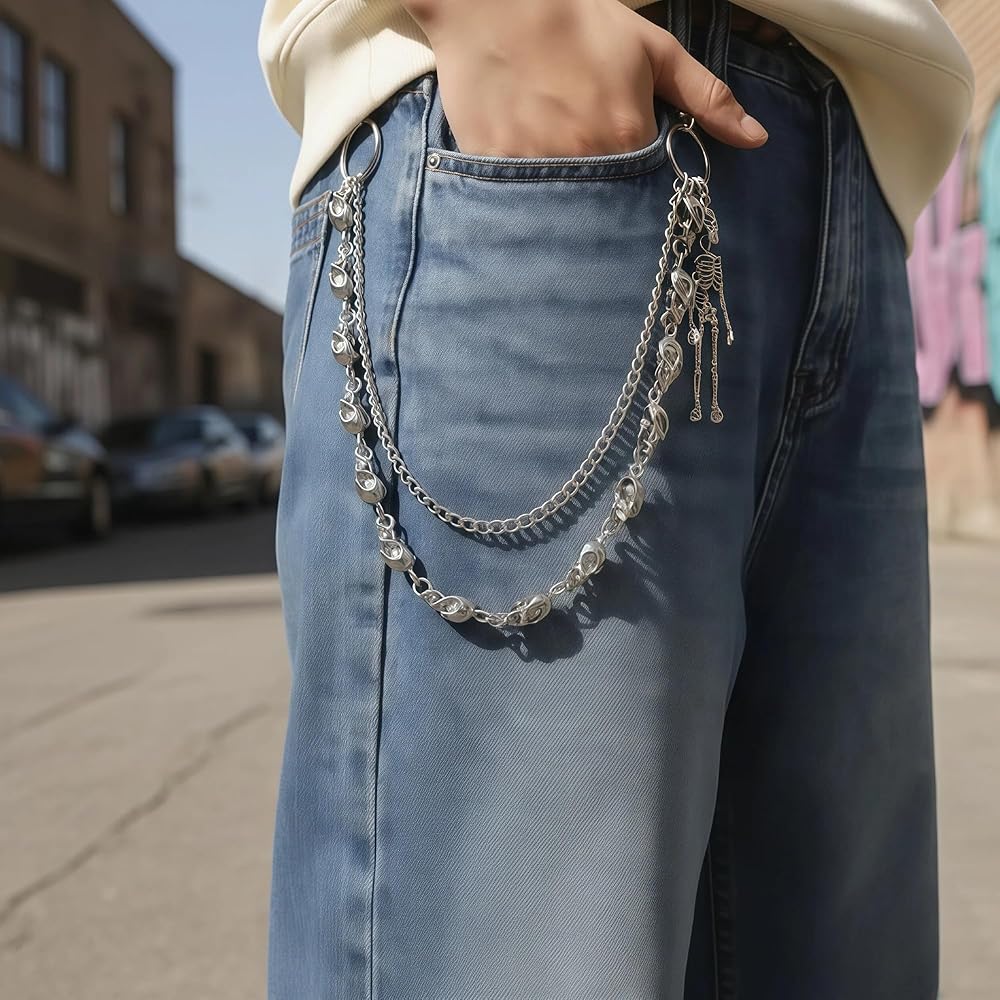 نمط قوطي مزدوج الطبقة - سلاسل مزدوجة جريئة مع لمسات جمجمة تضيف عمقًا وحركة إلى الجينز أو السترات أو التنانير؛ حافة فاسق/قوطي واضحة دون التغلب على مقاسك.