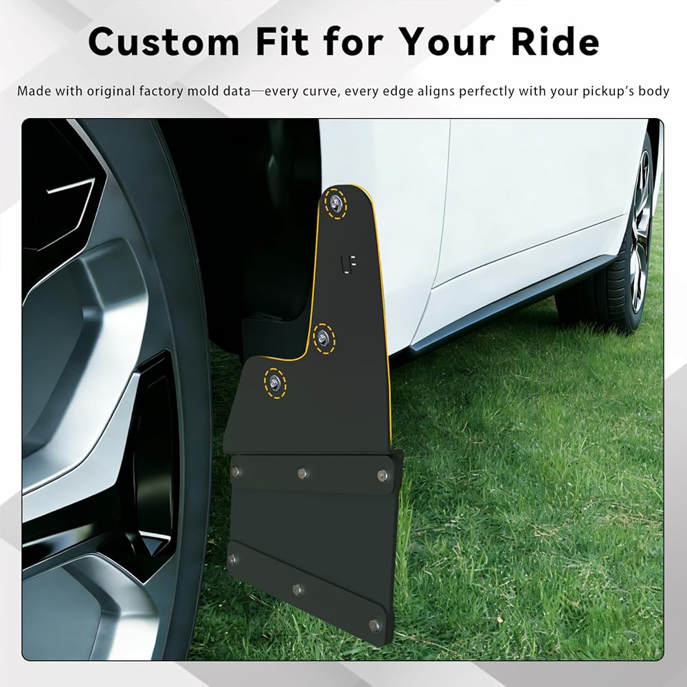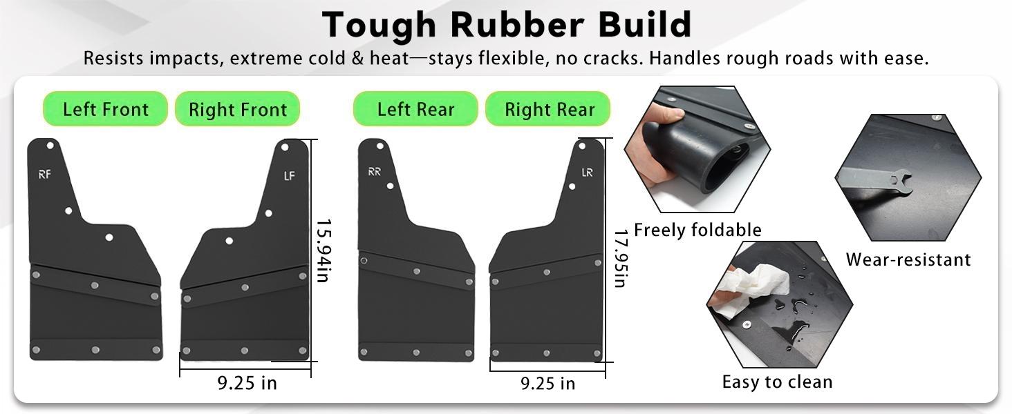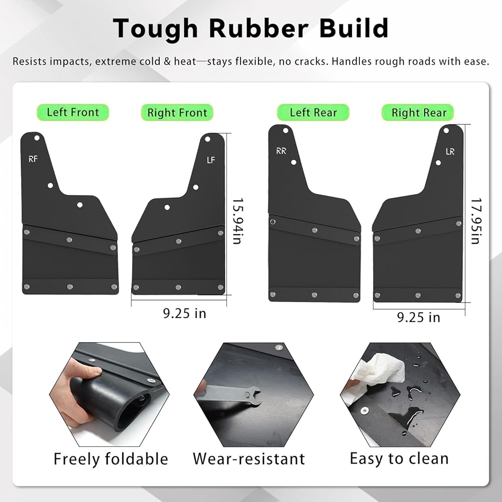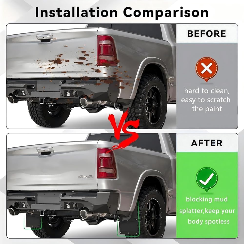 【مادة ممتازة】مصنوعة من قلب فولاذي وطبقة خارجية مطاطية مرنة، فهي تمزج بين مقاومة الصدمات الفولاذية (بدون تشوه) ومرونة المطاط في الطقس (-40 درجة فهرنهايت إلى 140 درجة فهرنهايت، بدون تشقق). يحجب الطين والصخور والأمطار وأوساخ الطريق من طلاء شاحنتك وهيكلها السفلي وعجلاتها، مما يحمي شاحنة رام الخاصة بك ويخفض تكاليف الصيانة على المدى الطويل.
