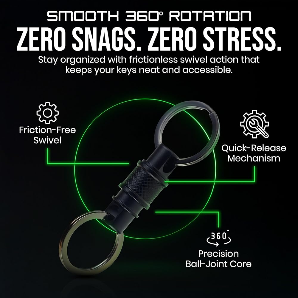 • دوران 360 درجة يمنع تشابك المفاتيح - تسمح المحامل الدوارة بسلاسة بالدوران الكامل للحفاظ على المفاتيح منظمة وغير متشابكة. لا مزيد من سلاسل المفاتيح الملتوية والمزدحمة التي تضيع وقتك في التحسس بالمفاتيح.