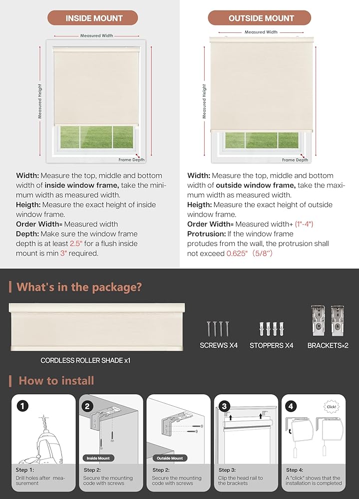 (Pls Note) For INSIDE mount, window frame should have at least 2” depth. Accessory kit includs metal brackets, screws and installation manual for convenience. Pls feel free to email us by Amazon message if there are any questions or missing accessories, and we will respond to you within 24 hours.